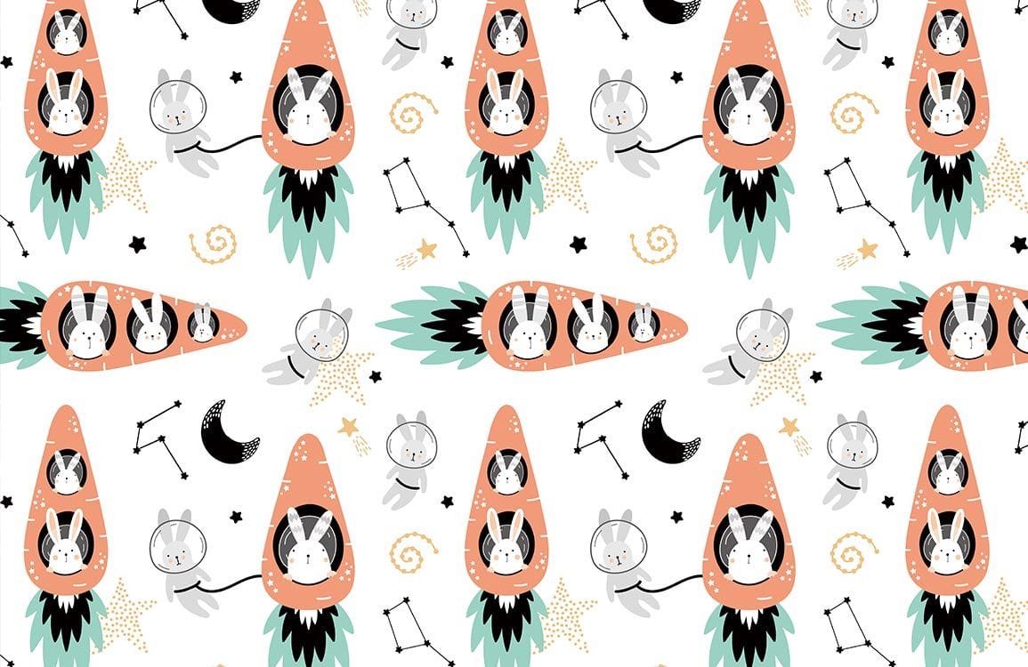 The Rabbit & Carrot Wallpaper Mural offers a whimsical blend of intricate illustrations featuring playful rabbits nestled in stylised carrots, set against a backdrop of starry constellations. Its charming design effortlessly complements both contemporary and vintage aesthetics, infusing spaces with a playful yet sophisticated charm. Each element, from the delicate line work to the inviting patterns, adds a layer of depth and character, making it a versatile choice for varied interior settings.