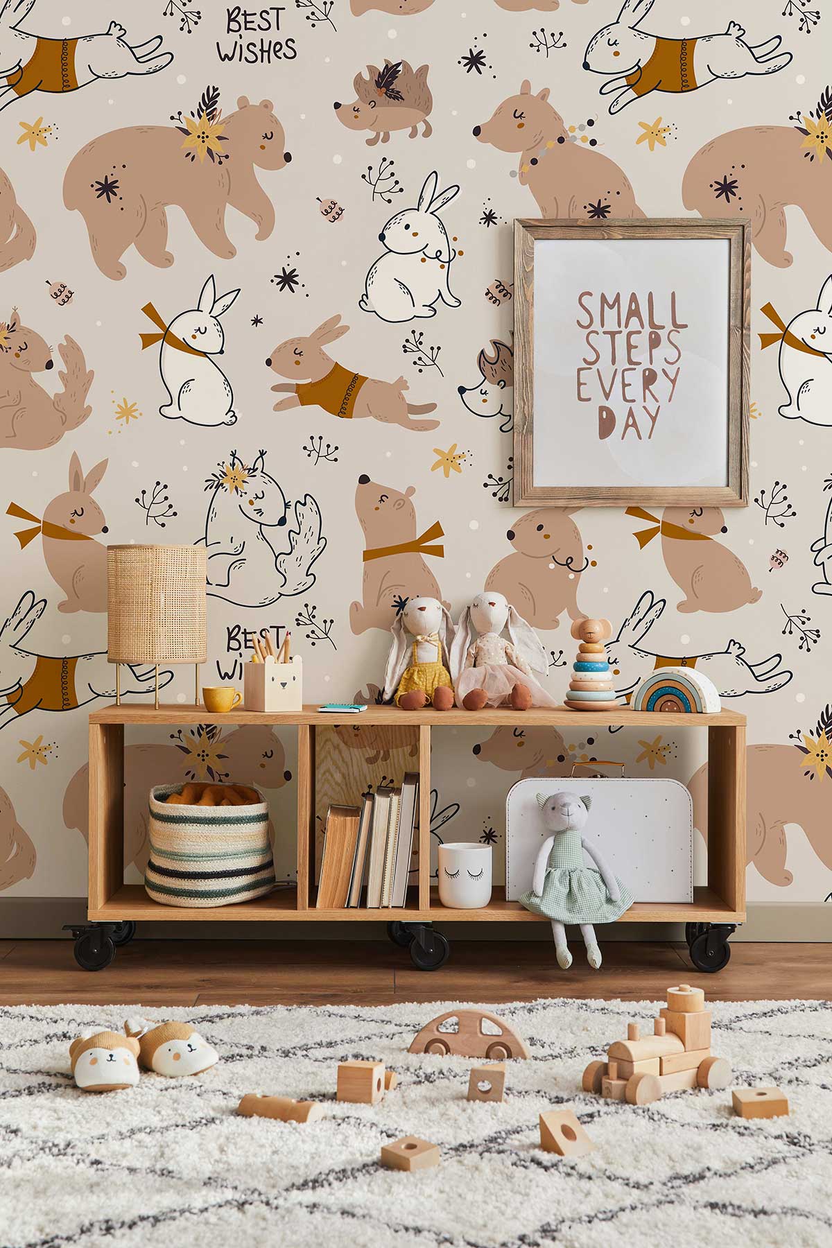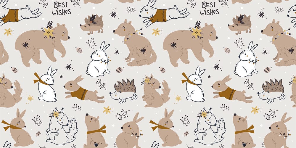 The Rabbit Friends Wallpaper Mural captivates with its charming ensemble of playful bunnies, quaint bears, and whimsical hedgehogs, rendered in soft, earthy tones that evoke warmth and nostalgia. Delicate illustrations adorned with gentle patterns lend a storybook quality to the design, inviting a sense of wonder and comfort into any space. Its sophisticated artwork elegantly balances between charmingly rustic and artfully modern, making it a delightful addition for both cosy nooks and refined living areas.