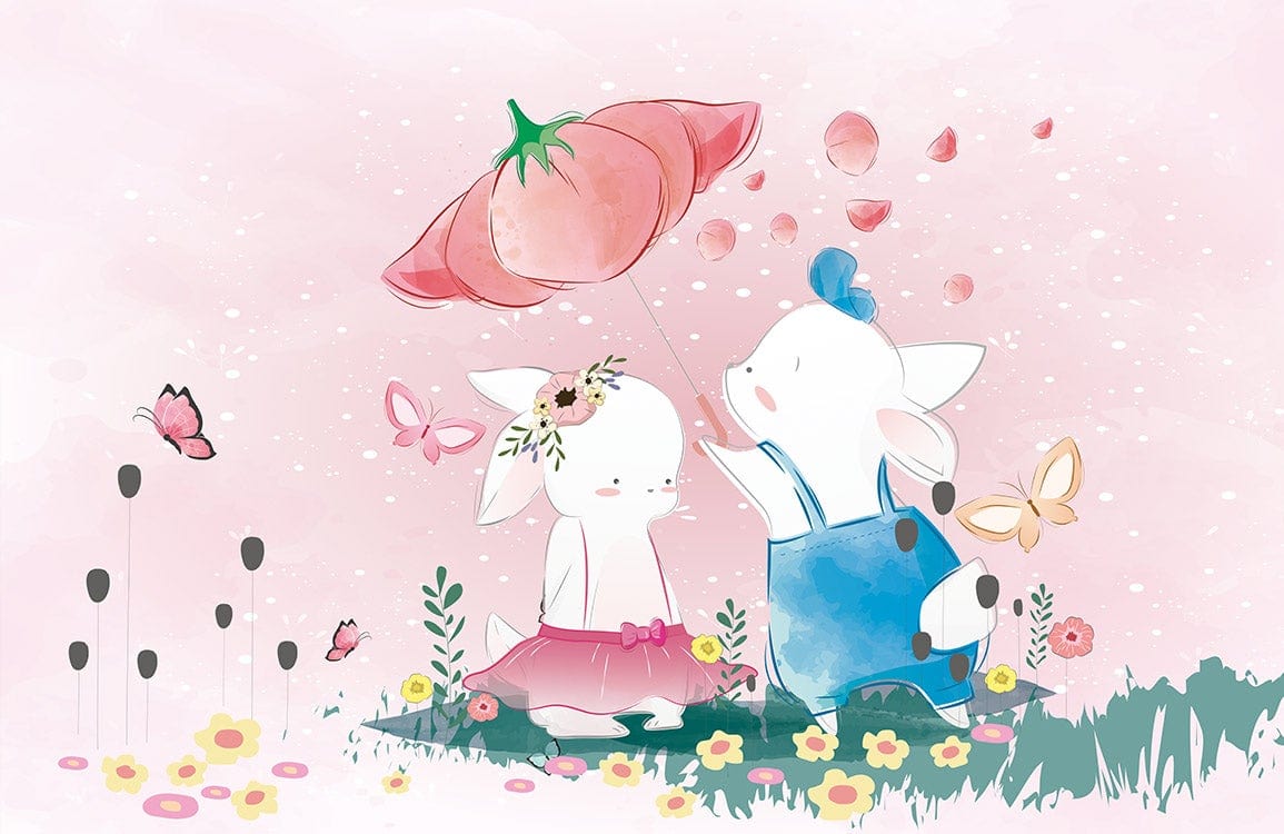 This whimsical Rabbit Lovers Wallpaper Mural captures the innocence of nature with its enchanting portrayal of playful rabbits surrounded by delicate floral motifs. Soft pastels gently blend with detailed illustrations, creating a soothing ambience that whispers elegance. Perfectly suited for diverse interiors, this mural radiates a charming aesthetic that is both timeless and versatile, offering an artistic touch to elevate any space it adorns.