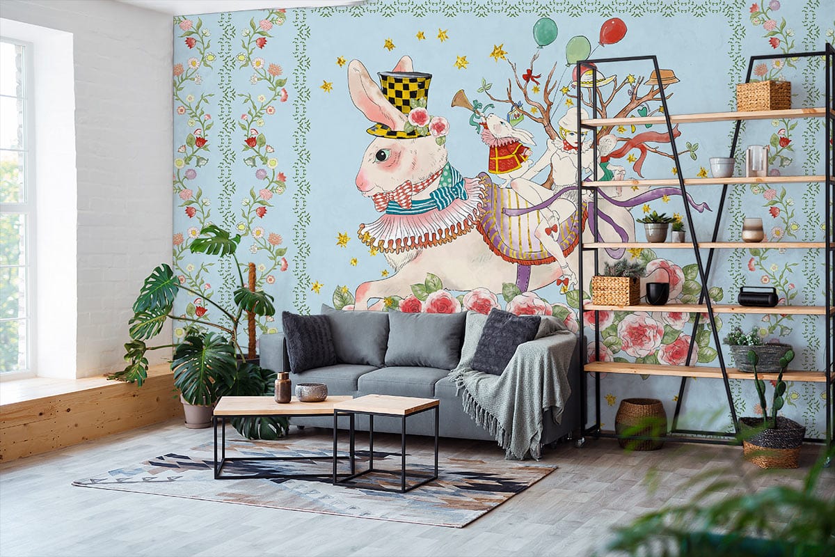 Embrace a whimsical journey with the 'Rabbits Flowers & Girl ll Wallpaper Mural'. This exquisite piece combines enchanting rabbits dressed in finery with a delicate floral motif, set against a serene blue backdrop. Perfect for adding a touch of magic, the detailed illustration complements both classic and eclectic decors, creating a captivating focal point in any room.