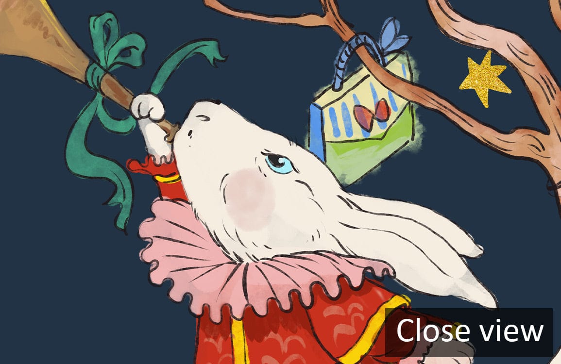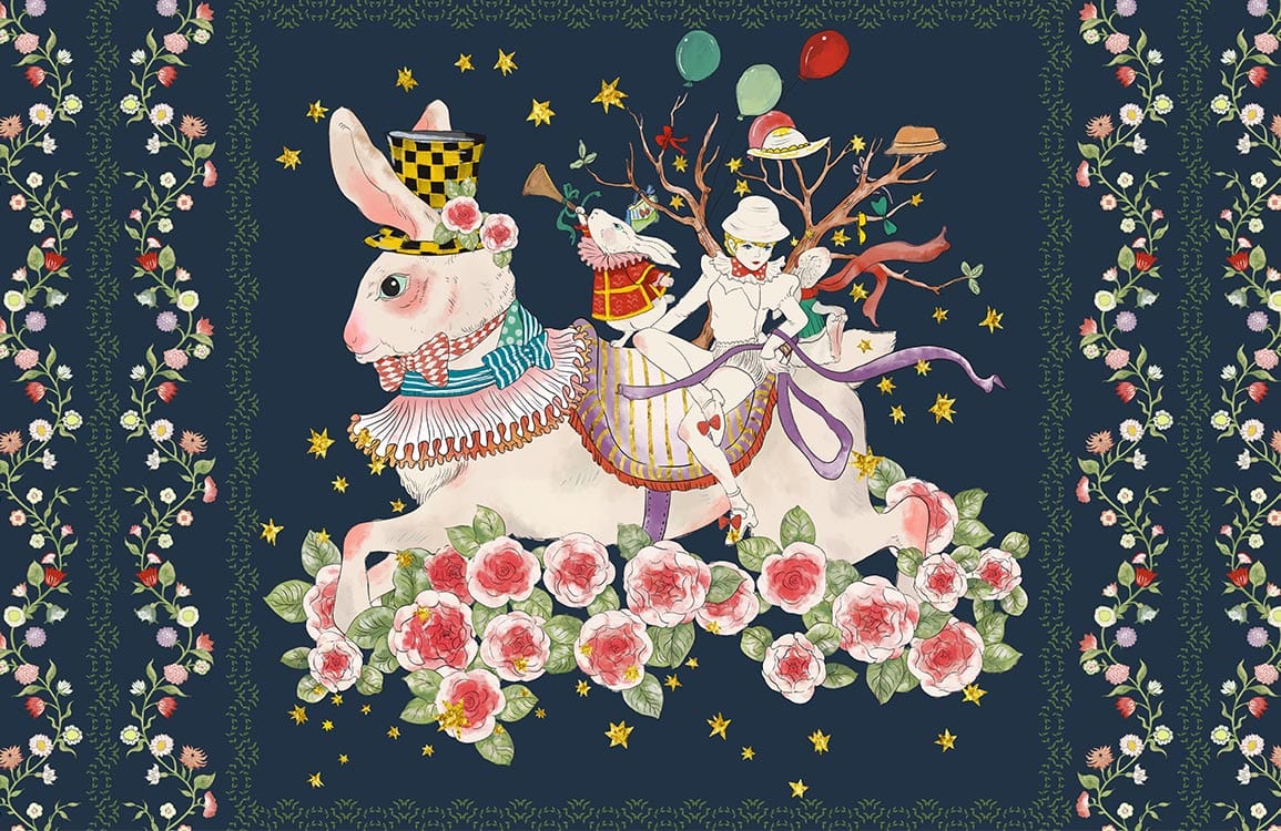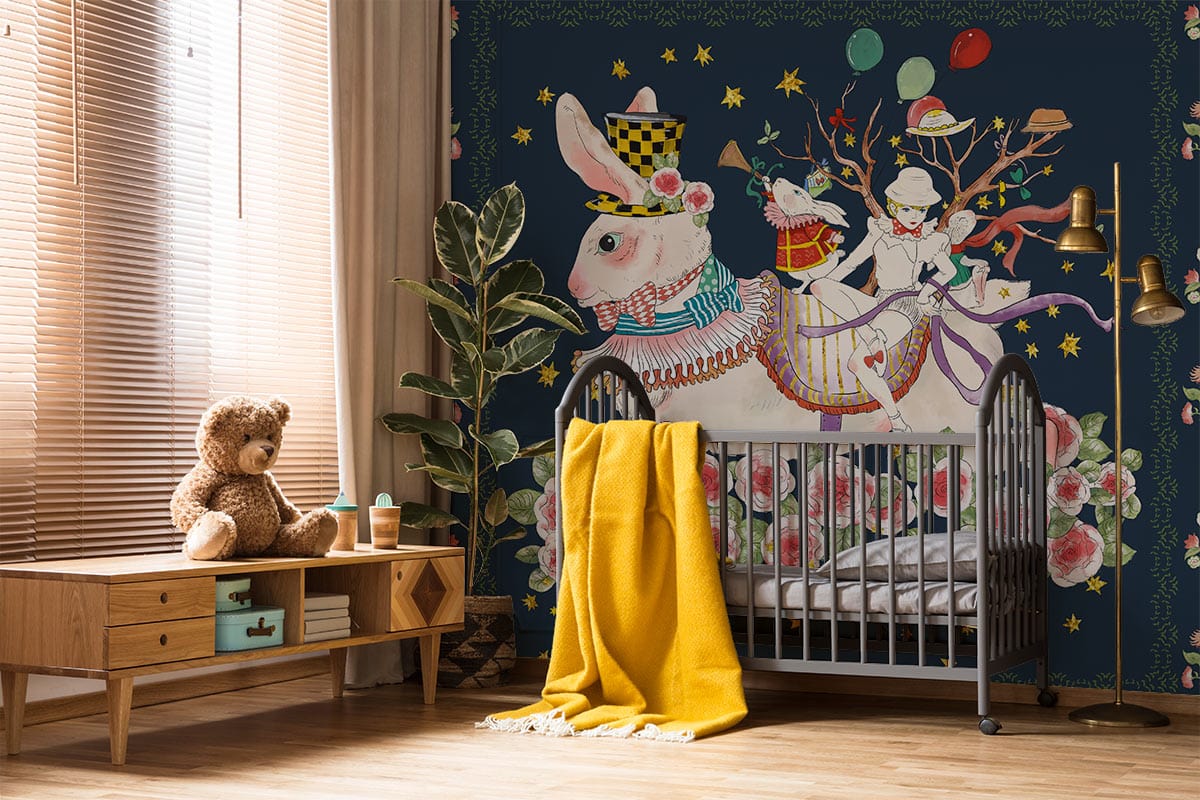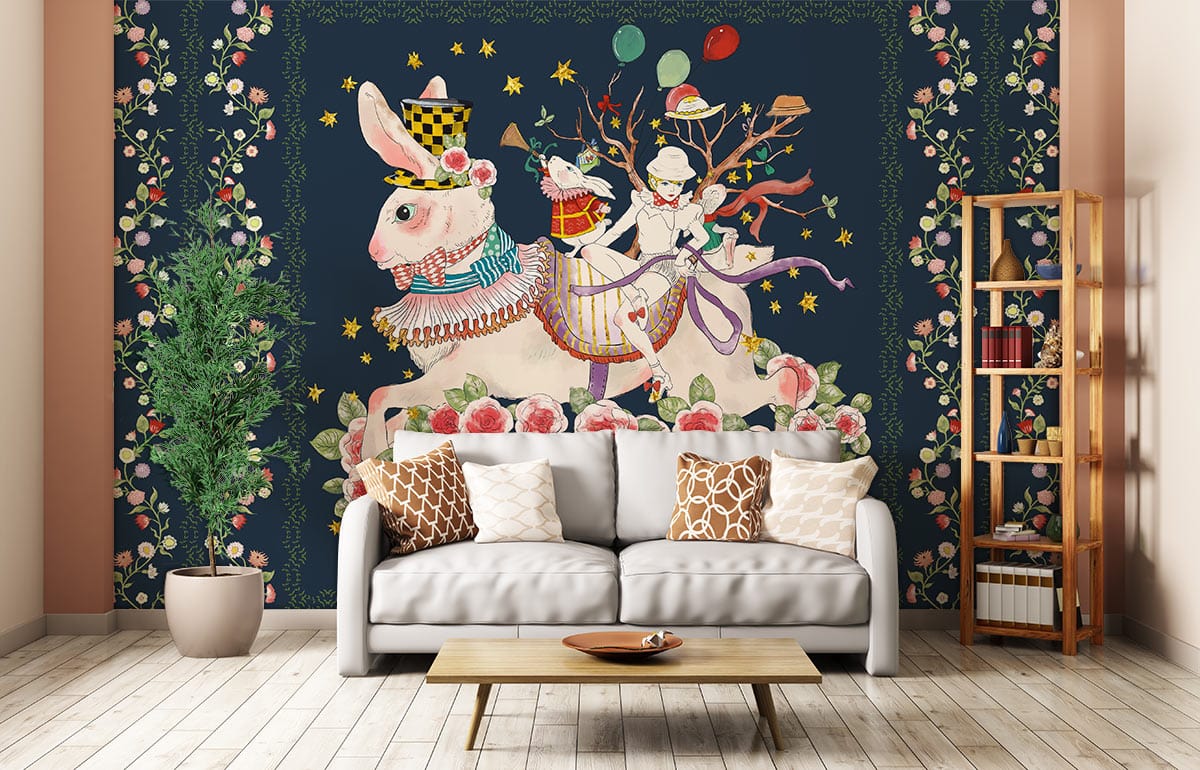 Embrace a whimsical journey with this captivating wallpaper mural, featuring an enchanting tableau of rabbits and floral motifs. The intricate design, set against a deep navy backdrop, melds vivid illustrations with soft accents, creating a playful yet sophisticated atmosphere. Ideal for spaces where creativity meets elegance, this mural offers a timeless charm that appeals to both nostalgic and contemporary tastes.