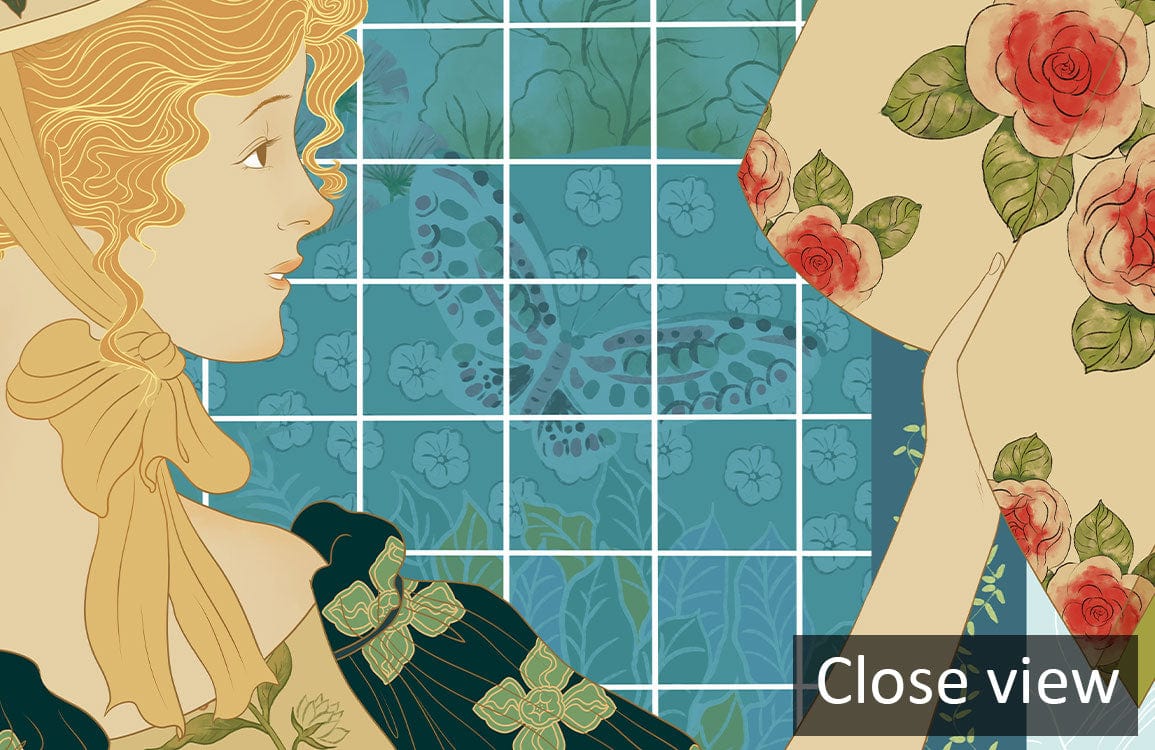 Immerse your space in elegance with the Reading Girl & Bloomy Vines Wallpaper Mural. This artistic piece features an enchanting depiction of a vintage-clad lady immersed in her book, framed by delicately entwined floral vines. The soft interplay of pastels and intricate patterns creates a charming and serene atmosphere, rich in texture and story. Its timeless design gracefully complements a range of interiors, perfect for those seeking a touch of artistic grace.