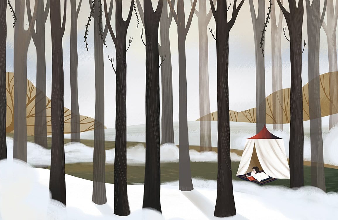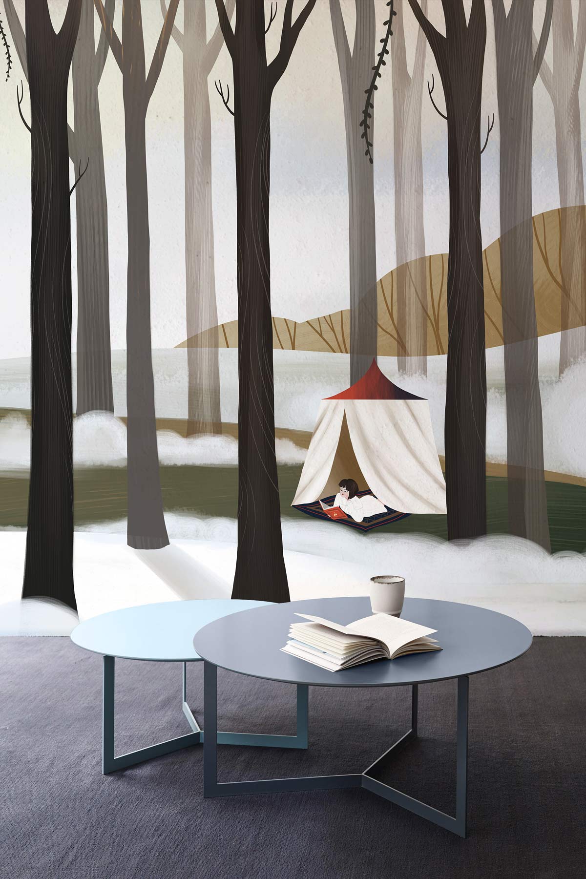 The Reading in The Woods Wallpaper Mural elegantly captures a serene woodland escape. With tall, graceful trees set against subtle, wintry landscapes, it evokes a sense of tranquillity and introspection. This mural's exquisite details, such as the gentle curve of branches and the soft tones of the ground, provide an immersive experience, making it perfect for adding a sophisticated touch to any room. Its timeless charm suits both contemporary and classic settings, offering a peaceful backdrop that encourages relaxation and creativity.