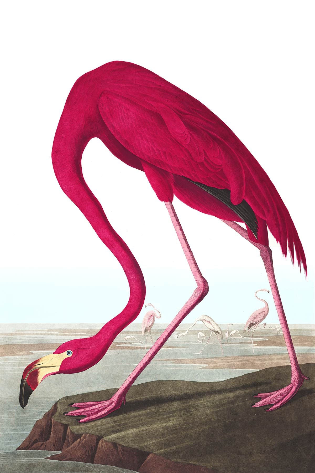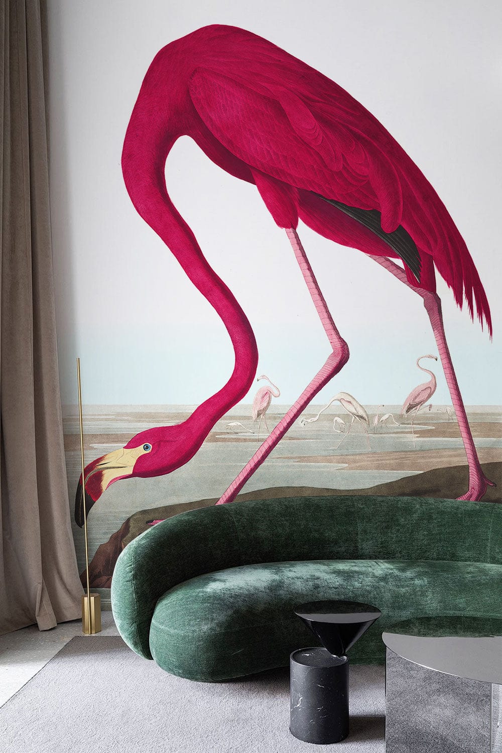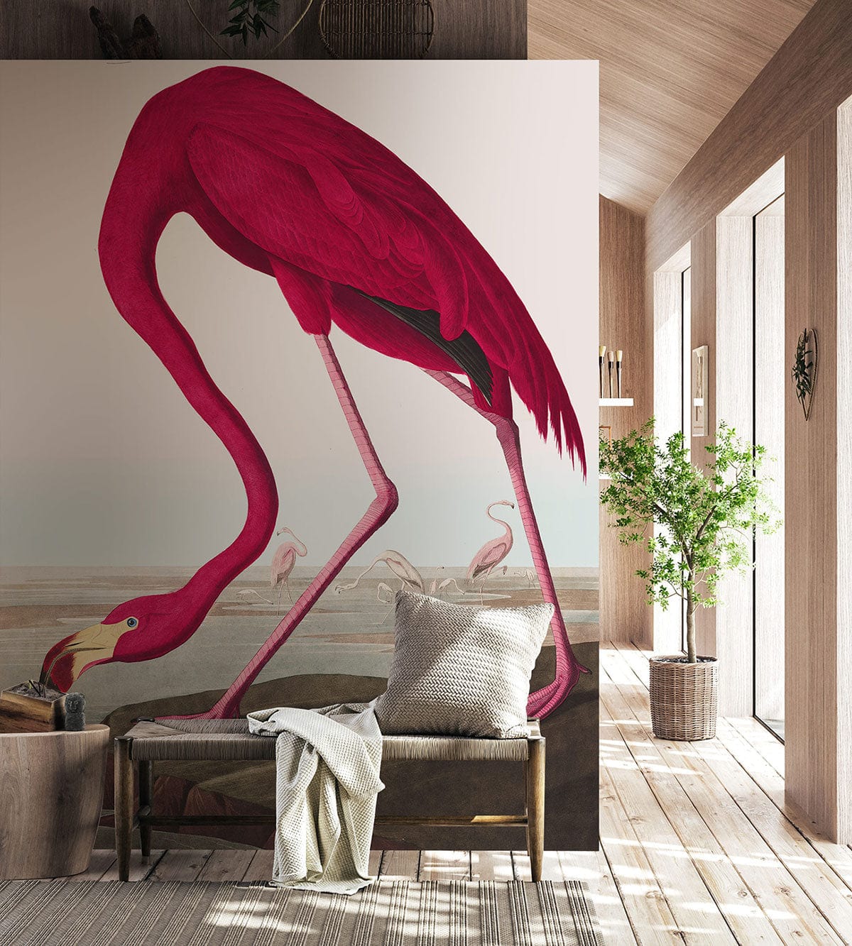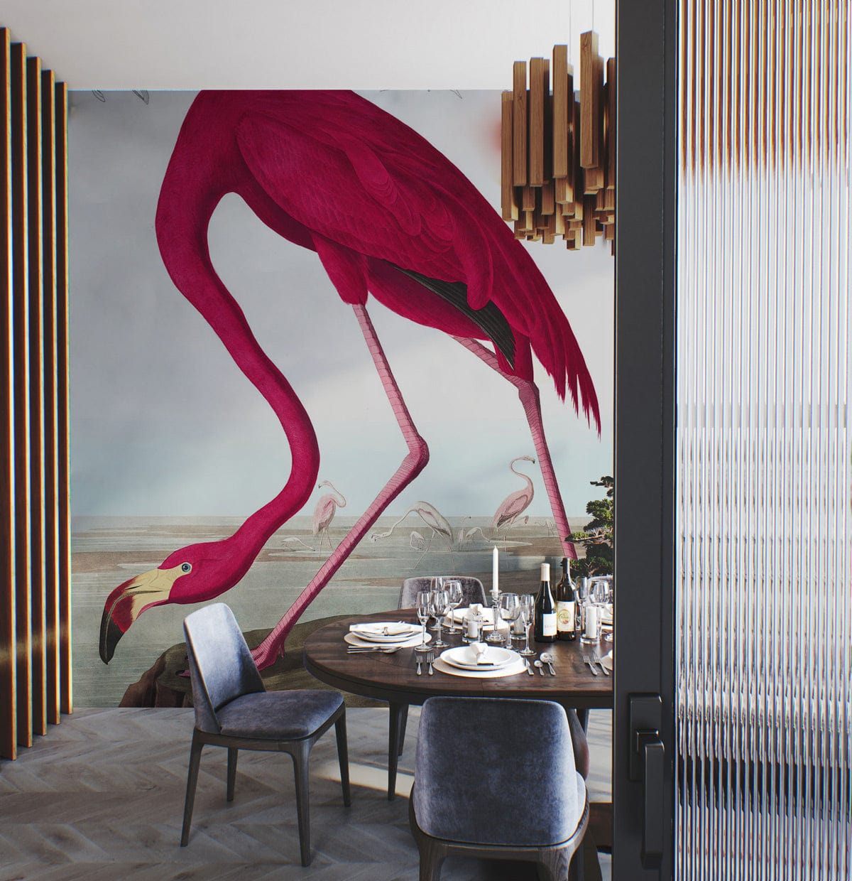 This pink pelican wallpaper mural is ideal decor to use as a background. This beautiful, amazing painting of a large pink pelican catching fish by the lake will be perfect for the indoors in your home. Interesting rendering with a natural atmosphere and a refreshing wall decoration perfect for any day and affable name: creatures with green scenes.