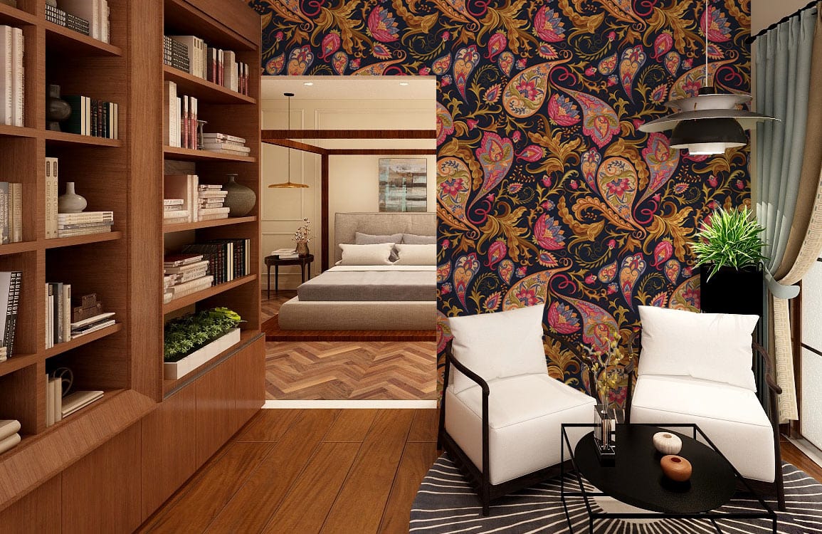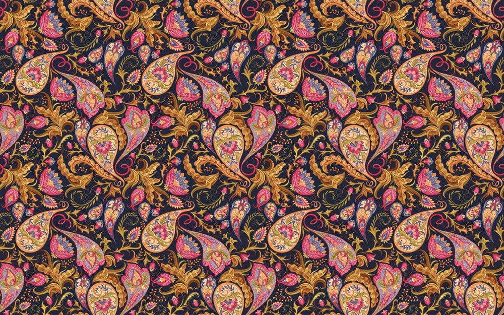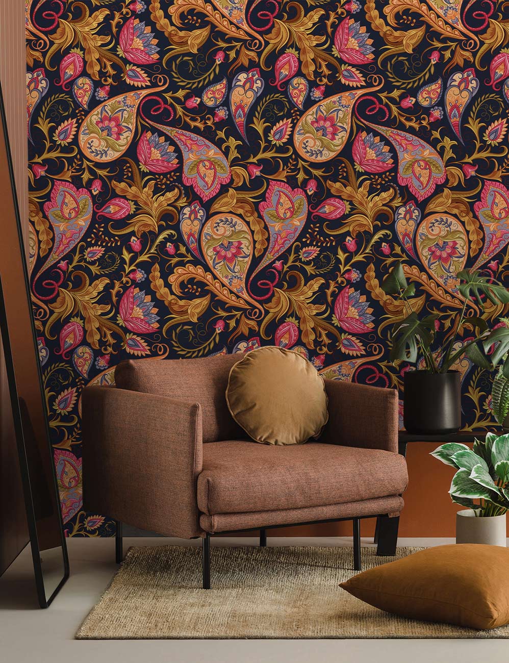 The Regal Paisley Nightfall Mural Wallpaper captivates with its intricate paisley patterns, evoking a sense of timeless elegance and cultural richness. With vivid swirls in shades of gold, deep navy, and vibrant pink, this wallpaper seamlessly fuses classic motifs with a contemporary flair. Ideal for living spaces, bedrooms, or offices, it effortlessly instils an air of sophistication, transforming walls into artistic canvases that invite admiration.