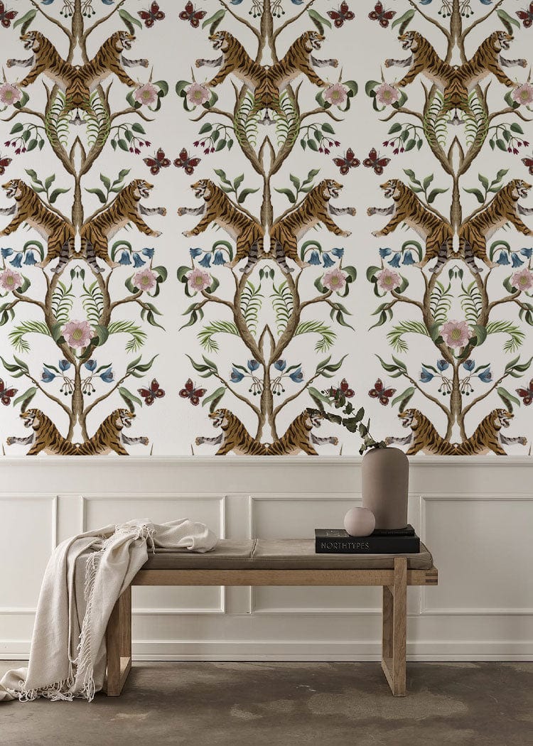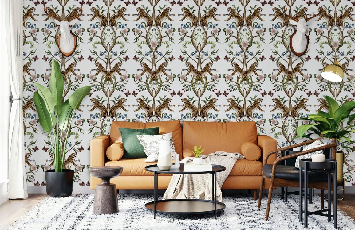 The Repeat Tigers Wallpaper Mural captures the majesty of nature with a sophisticated repeat pattern of tigers intertwined with lush botanical elements. Delicately drawn lines and intricate detailing create a sense of depth and artistry, making it an exquisite choice for truly unique interiors. Its timeless design easily complements both classic and contemporary spaces, creating a refined ambience that invites admiration.