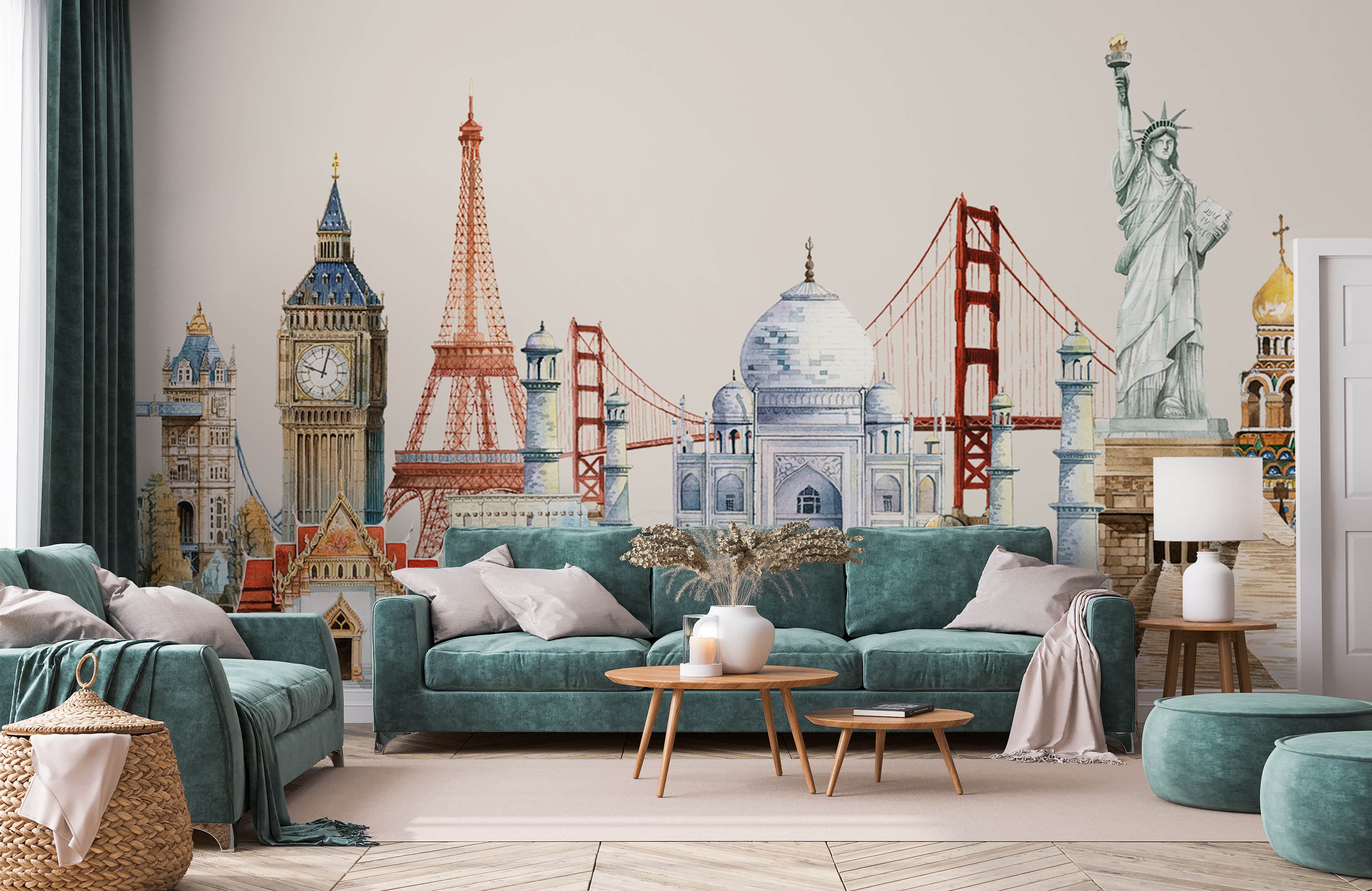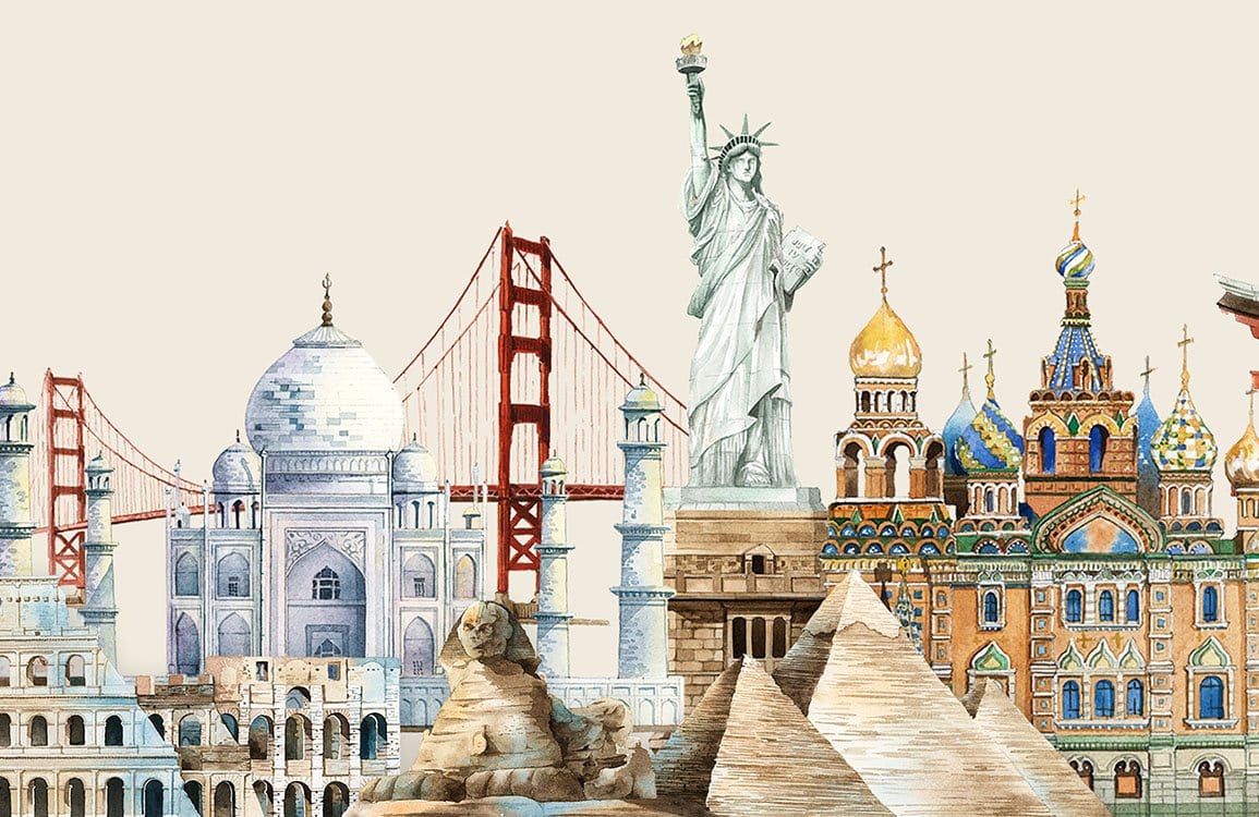 Embrace the world's architectural wonders with this captivating mural, showcasing iconic landmarks with exquisite detail and texture. Its harmonious blend of artistry and history makes it a distinguished choice for diverse interiors, adding depth and a cultured elegance to any environment.