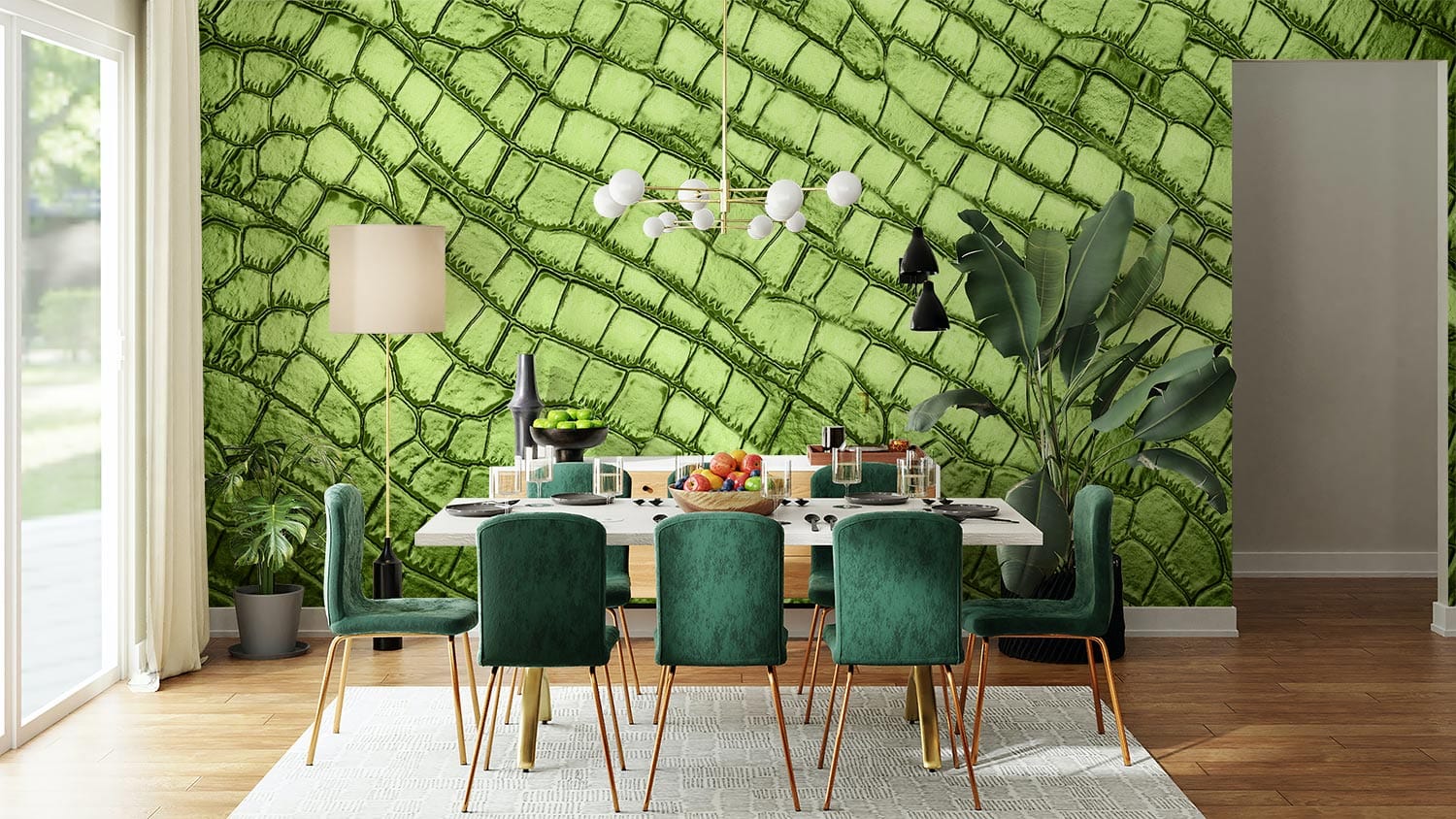 You will be absolutely amazed at this stunning faux crocodile skin wallpaper! Install this eye-catching bright green crocodile wallpaper mural as your feature wall to achieve a beautiful and stylish look! It will look even better if you pair it with white and pastel furniture and home decors.