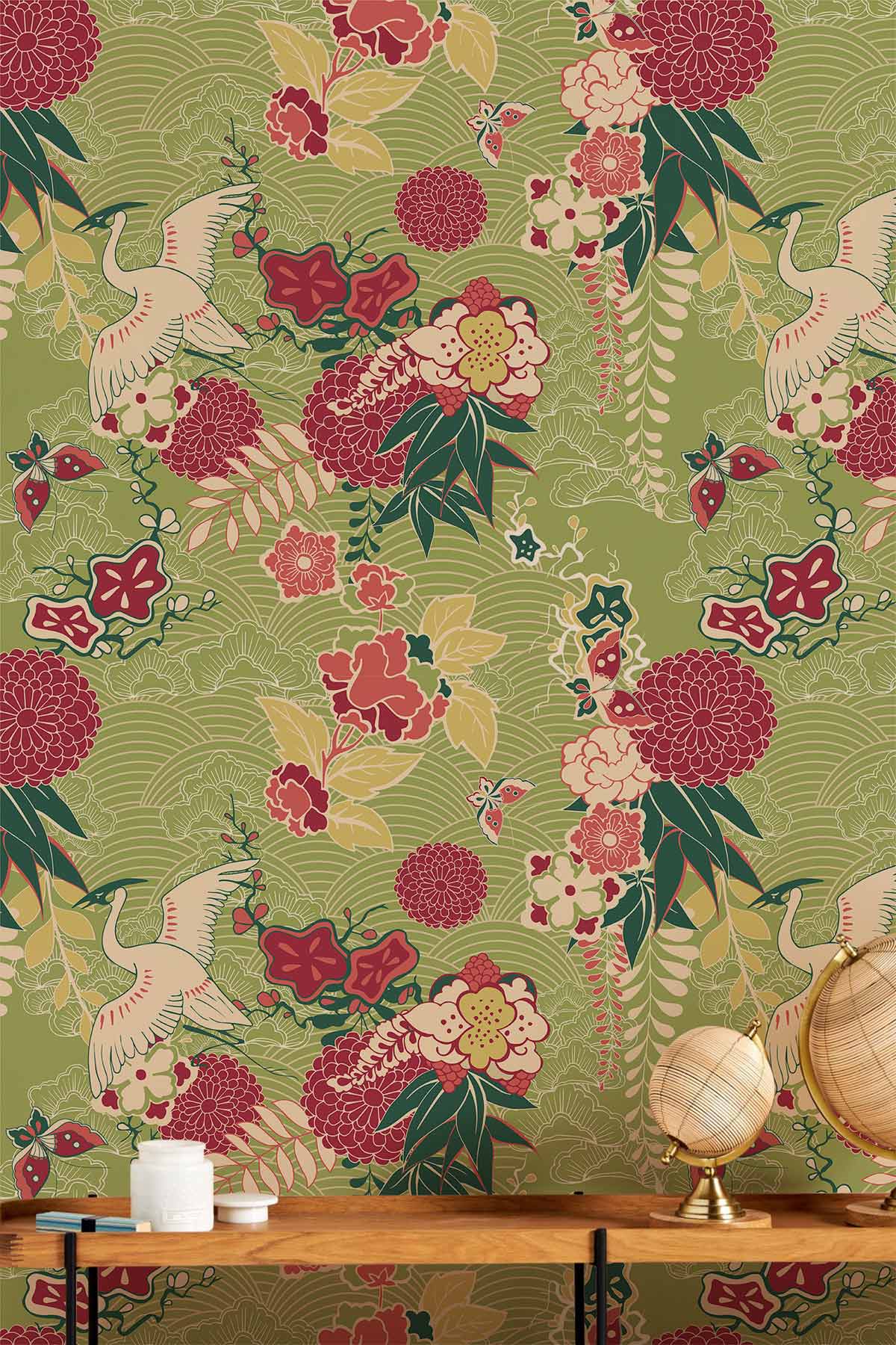Create a beautiful, elegant space in your home with this wonderful wallpaper mural, retro flowers and birds. Beautiful green background, atop of it are the burgeoning flowers and vigorous cranes. It鈥檚 a fascinating retro style. Perfect to be installed in your dining room, hallway and restaurant. And you will be placed in a marvelous wonderland of heaven.
