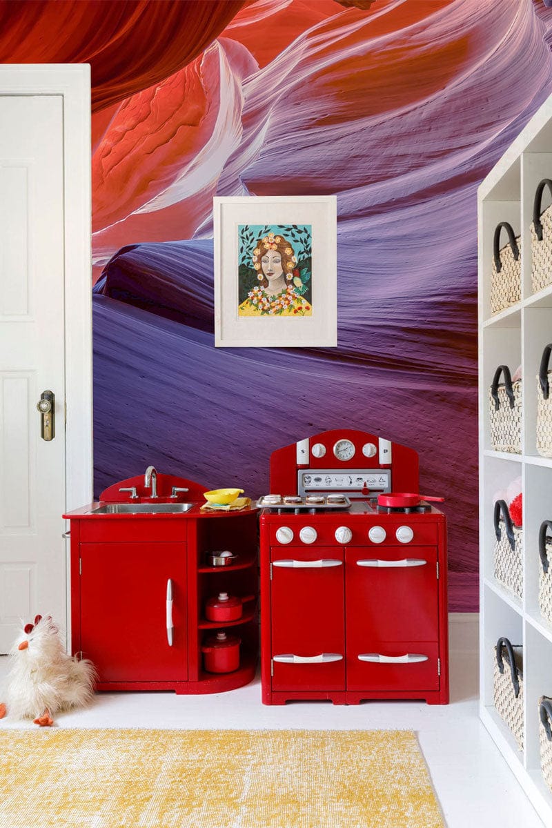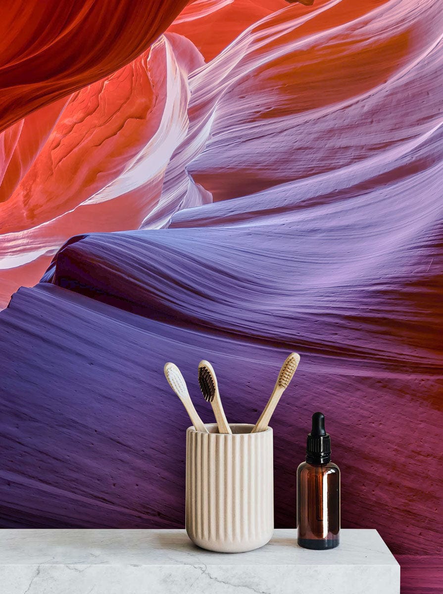 The Rock Internal Wallpaper Mural exudes a captivating interplay of natural rock formations and fluid lines, drawing the eye with its sweeping curves and dynamic textures. The rich, earthy tones of burnt orange and deep violet intermingle, creating an atmospheric and sophisticated backdrop. This mural serves as a statement piece, effortlessly blending into contemporary, eclectic, or even minimalist interiors, imparting a sense of natural elegance and timeless appeal.