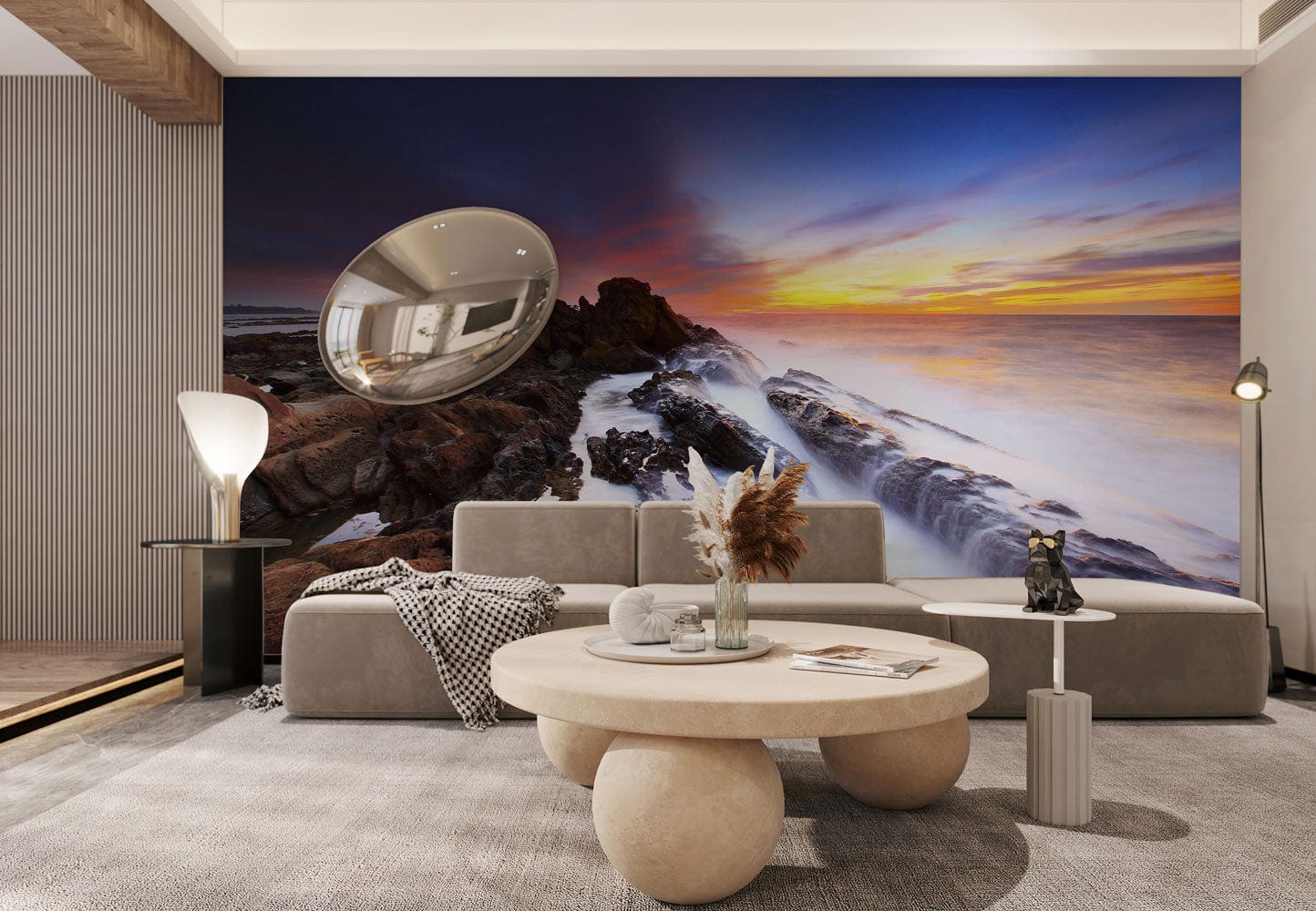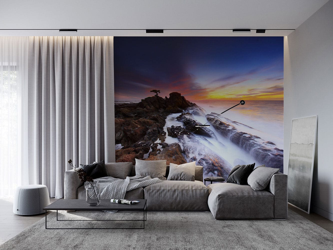 Embrace the striking beauty of the shore with the Rock on Ocean Wallpaper Mural, where rugged cliffs meet the serene waves, painted in vivid hues of dawn. This mural captures the harmonious blend of nature's power and tranquillity, enveloping your space in an aura of sophistication. Its intricate textures and vibrant landscape create a captivating focal point, perfectly suited for interiors that crave a timeless elegance.