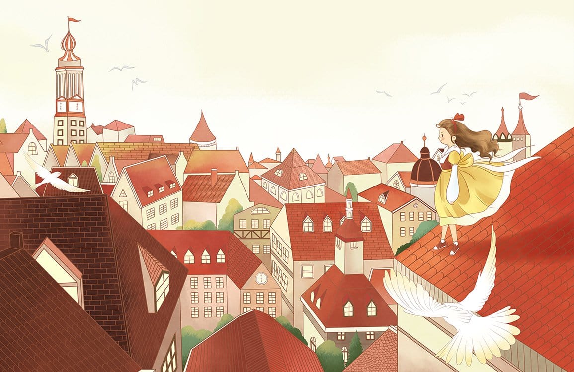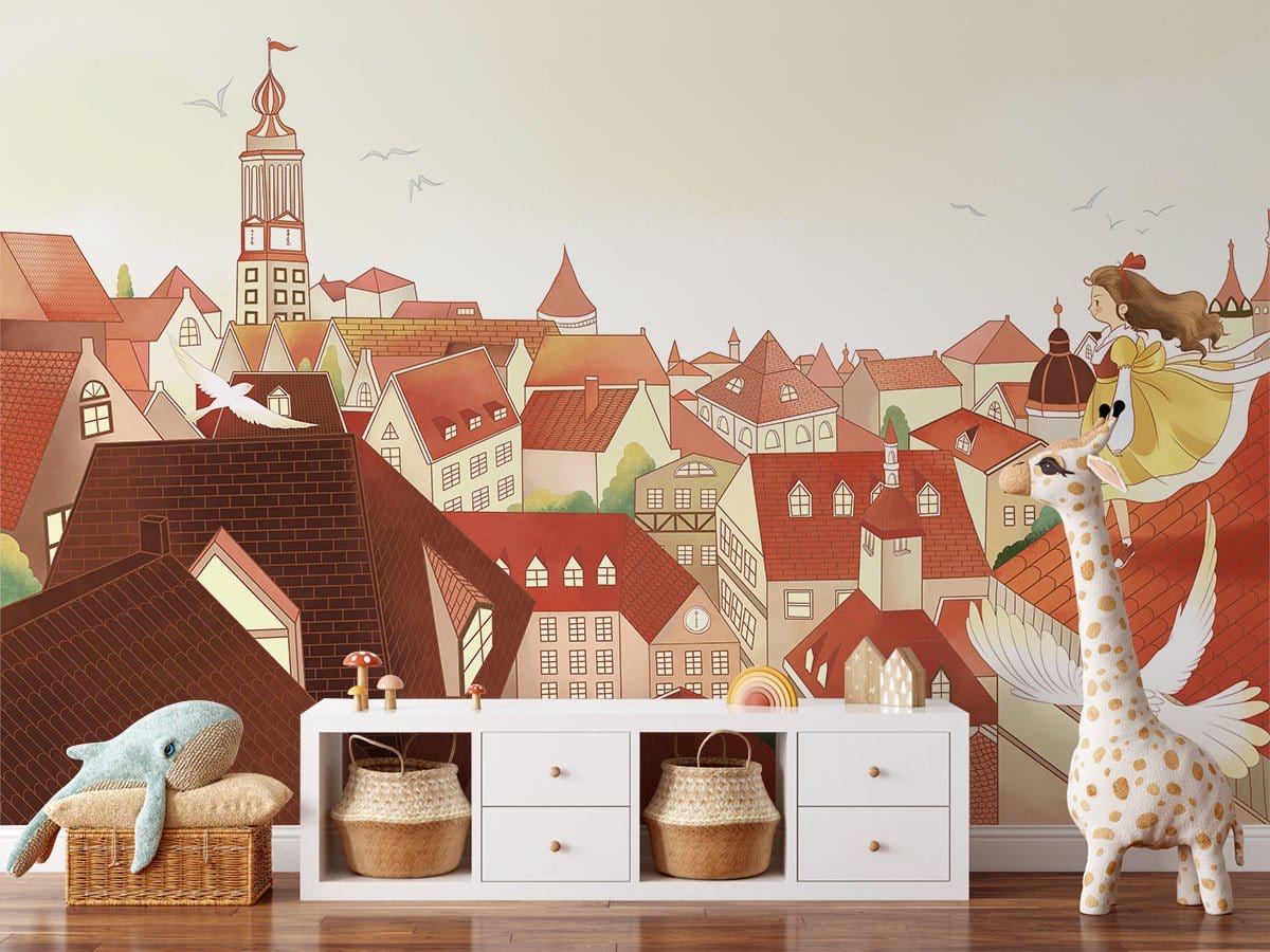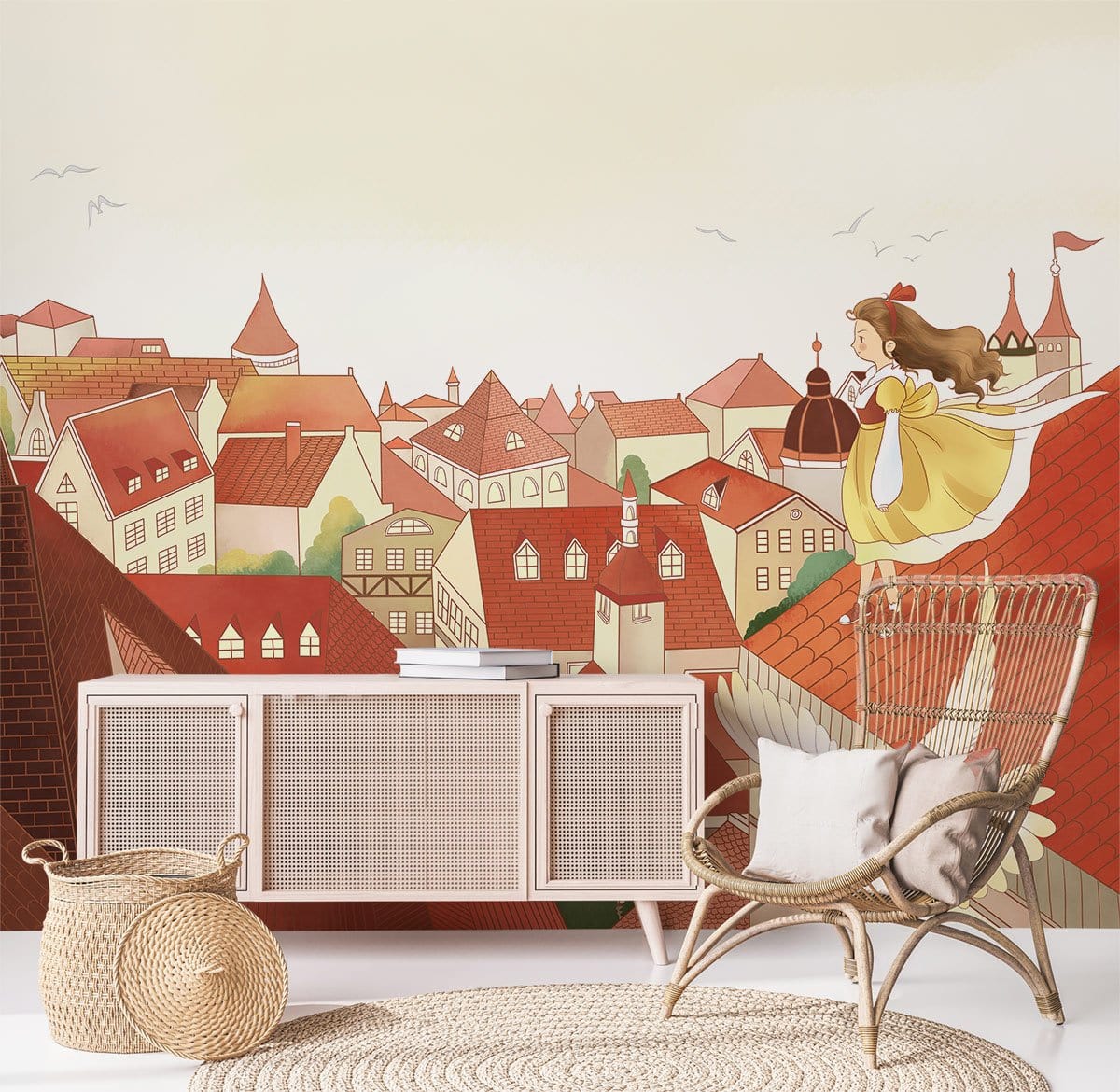 Bring a spectacular vibe to your space with this beautiful girl on the roof wallpaper mural. The artwork featuring a cute little girl standing on top of the red roof peering into the distance, which will immediately bring your walls to life. Use it as a feature wall in your little girl's room to revamp her space and make her smile!