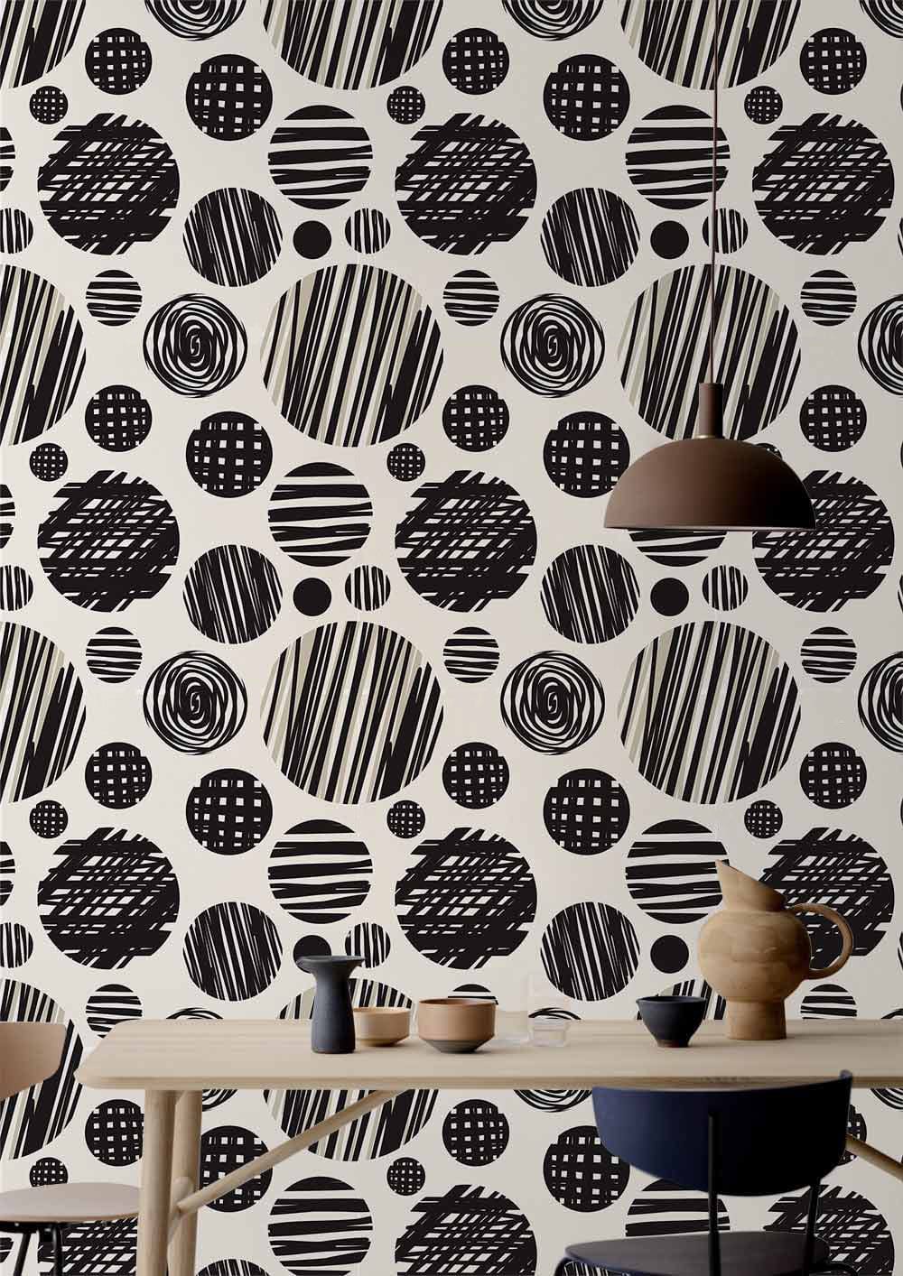 If you are looking for a black & white art deco wallpaper mural for a stylish and unique home, then this repeated circle pattern wallpaper mural is your perfect choice. This wall covering designed with black doodle circle patterns under a creamy white tone background, which will surely enhance the look of your living space.聽The pastel background shows a a beautiful visual contrast with the dark circle pattern, which makes the whole design attention-getting on a large scale.