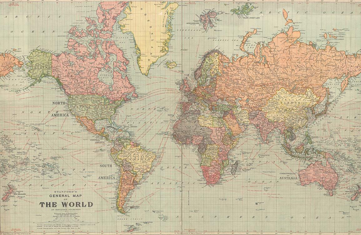 Royalty Standards Wallpaper Mural exudes sophistication with its intricate vintage world map design, rich in historical detail and charm. The muted earth tones blend superbly with any interior, providing a tasteful backdrop for eclectic or traditional settings. Perfect for those who appreciate both art and utility, this mural brings a touch of timeless exploration into spaces, inviting curiosity and conversation.