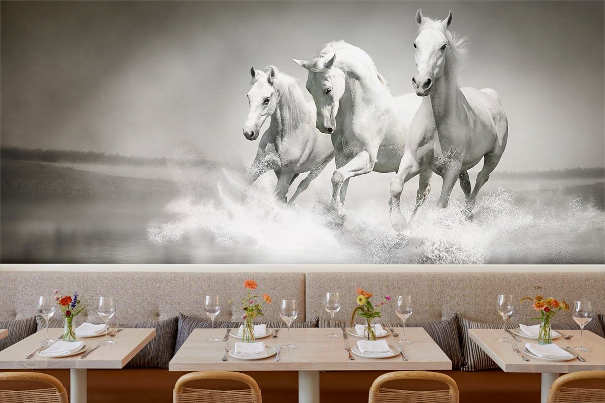 Immerse your space in the majestic beauty of galloping horses with this exquisite wallpaper mural. The design captures the fluid grace and boundless energy of running horses set against a misty, ethereal backdrop. Ideal for creating a tranquil, yet dynamic atmosphere, this mural brings an air of sophistication and timeless charm to any room.