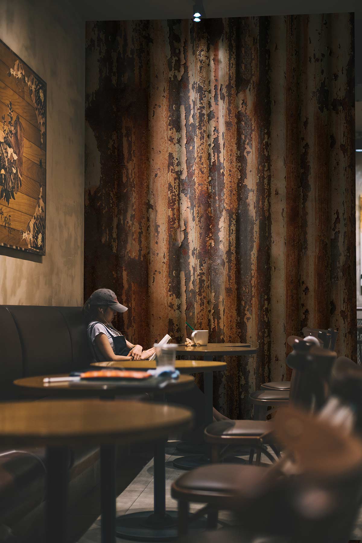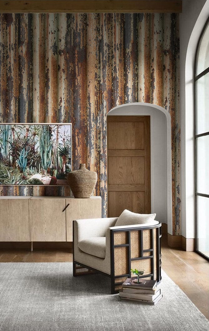Your walls are about to get a blast from the past with this retro graphic Rust Steel Wallpaper Mural. Through its rust- coloured roof design and textured pattern, this seamless wallpaper mural will give you an industrial throwback. The formality of our high-class, traditional living room is balanced by the warmth and familiarity of metal rust tones, soft lighting, and patterned print. A decorative ceiling light fixture provides illumination for the space while bringing the modern, urban theme of a heavily rusted steel surface into any room, be it a study or a bathroom.