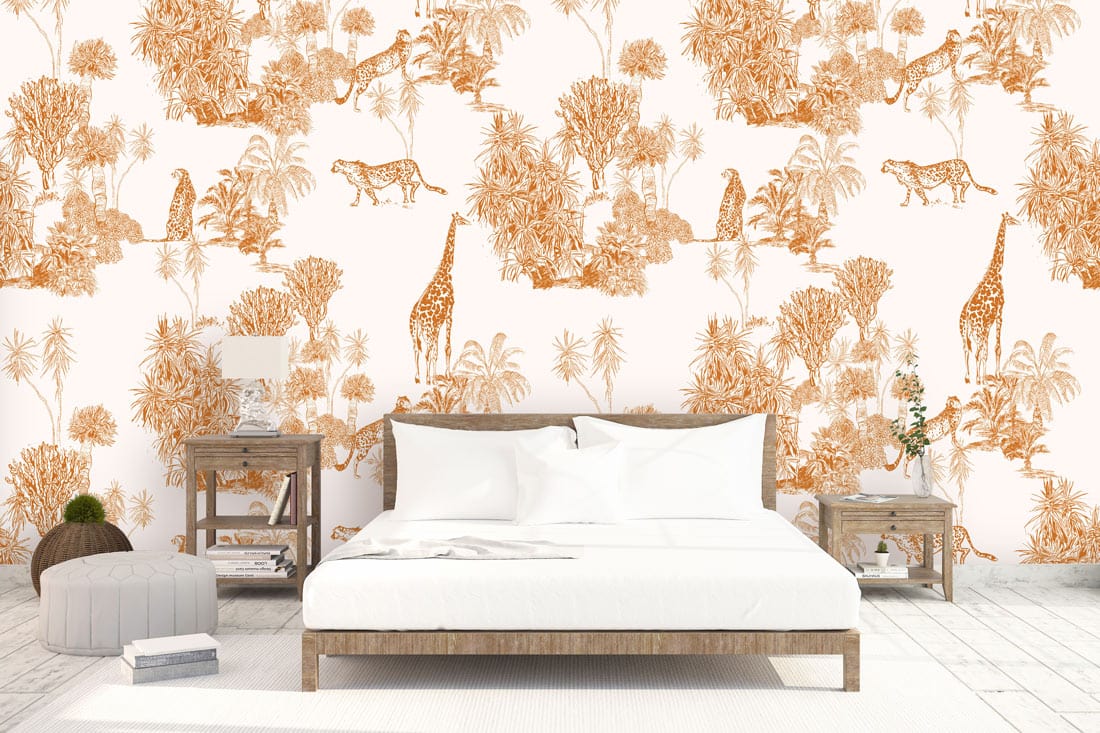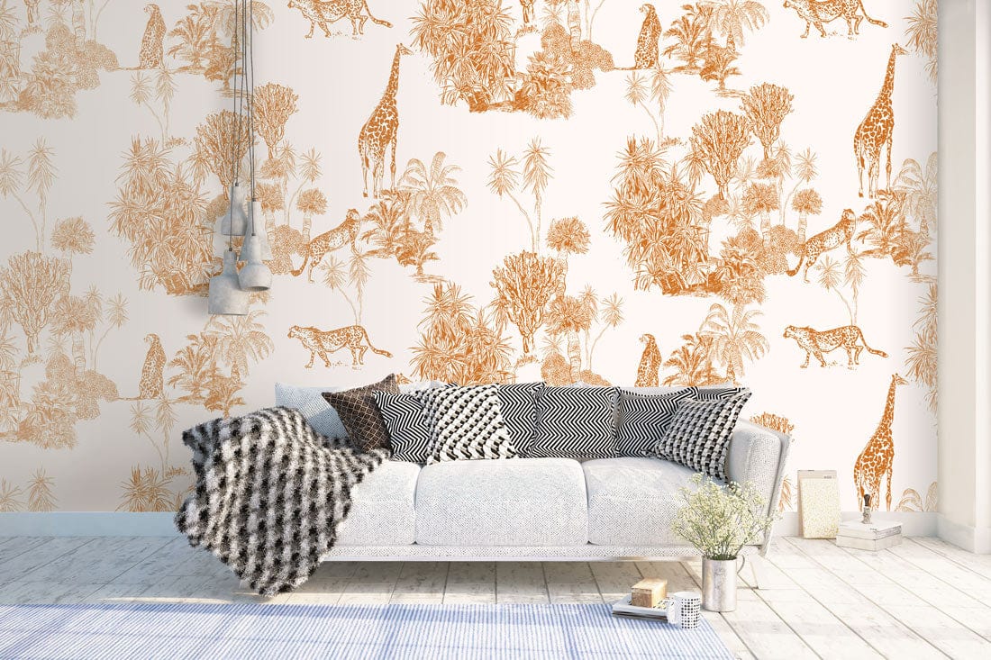 Immerse yourself in the untamed elegance of the Safari Serenade Wilderness Adventure Mural Wallpaper. This exquisite design showcases intricately detailed wildlife scenes, featuring graceful giraffes and leopards against a backdrop of lush, stylised trees. The seamless fusion of nature-inspired artistry and refined detailing offers a sophisticated touch to any room, creating an atmosphere of tranquillity and timeless beauty.