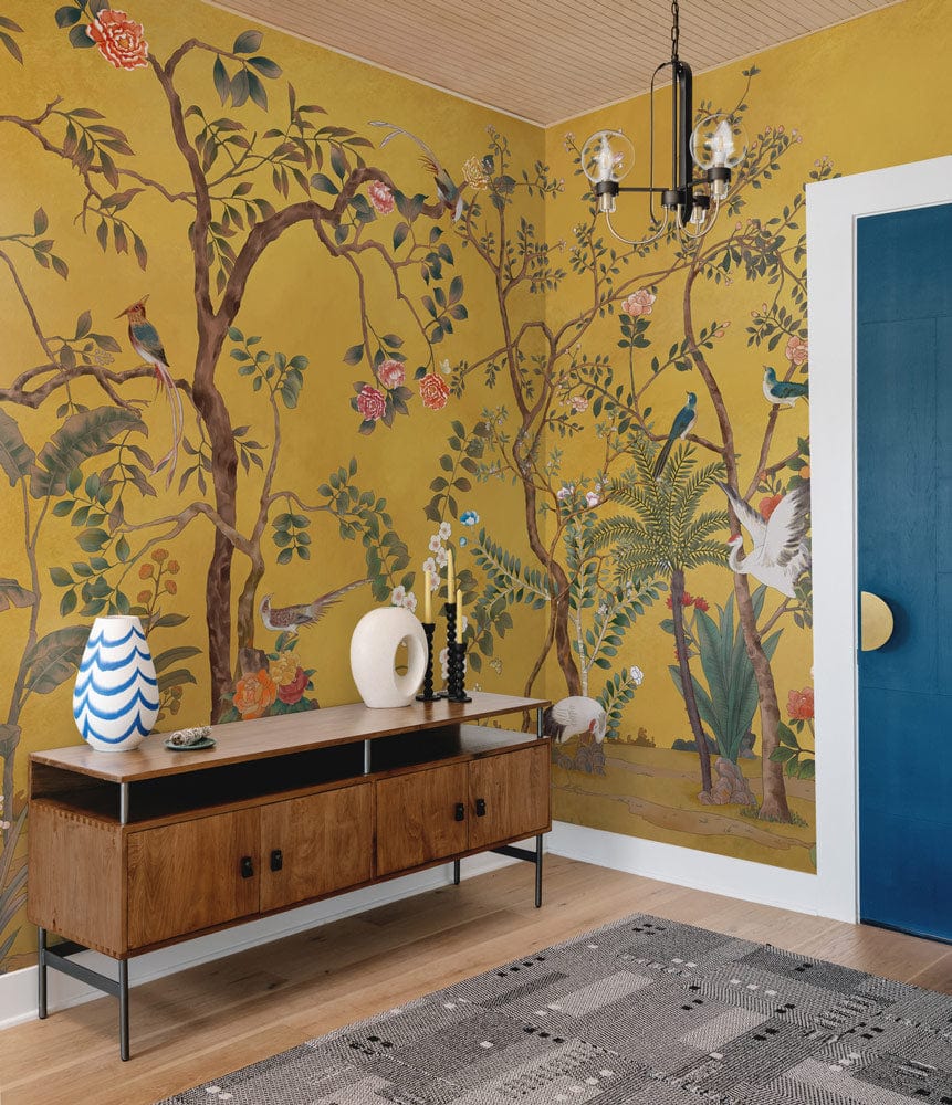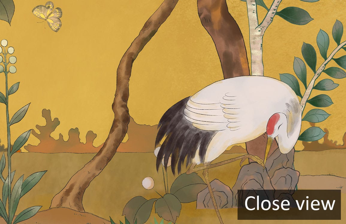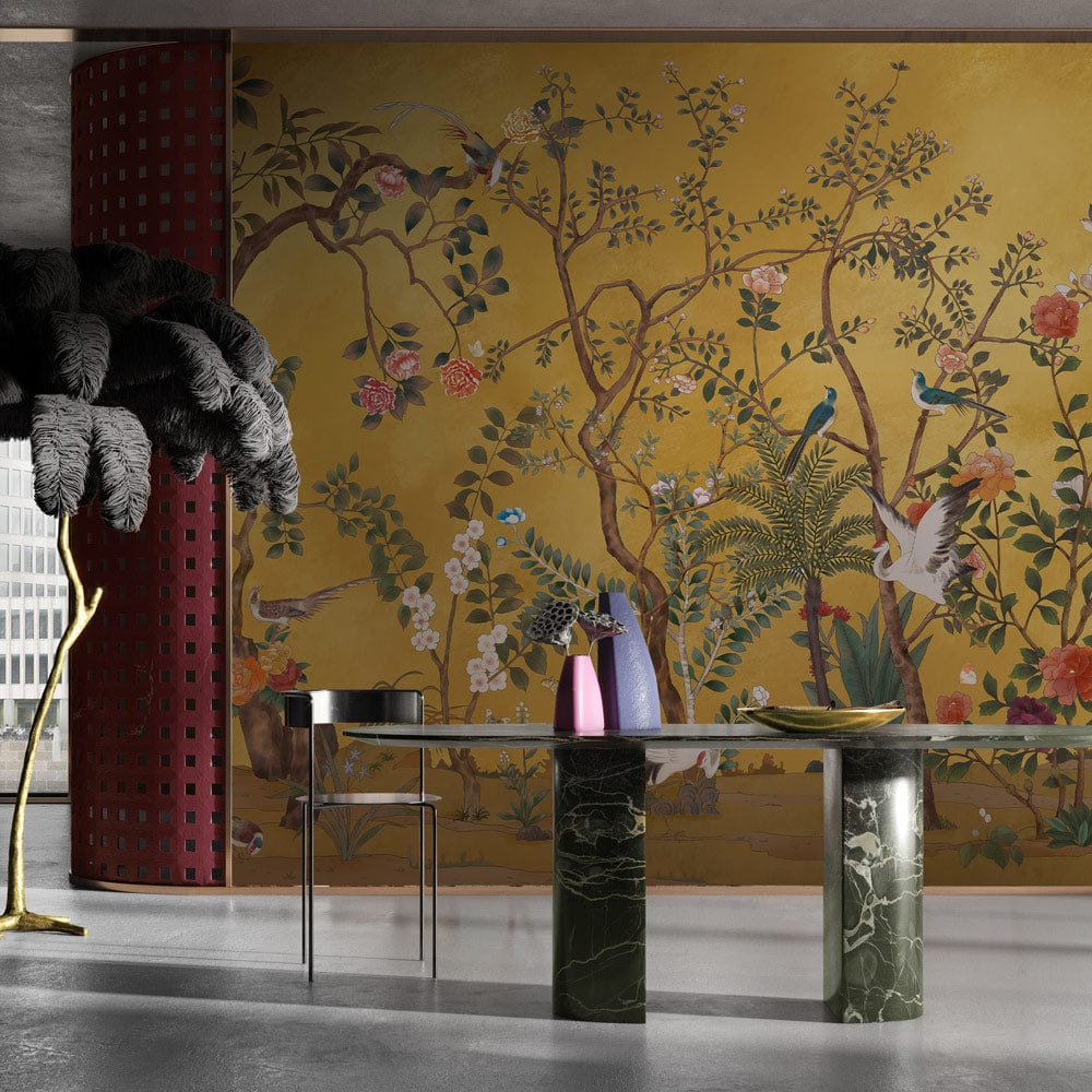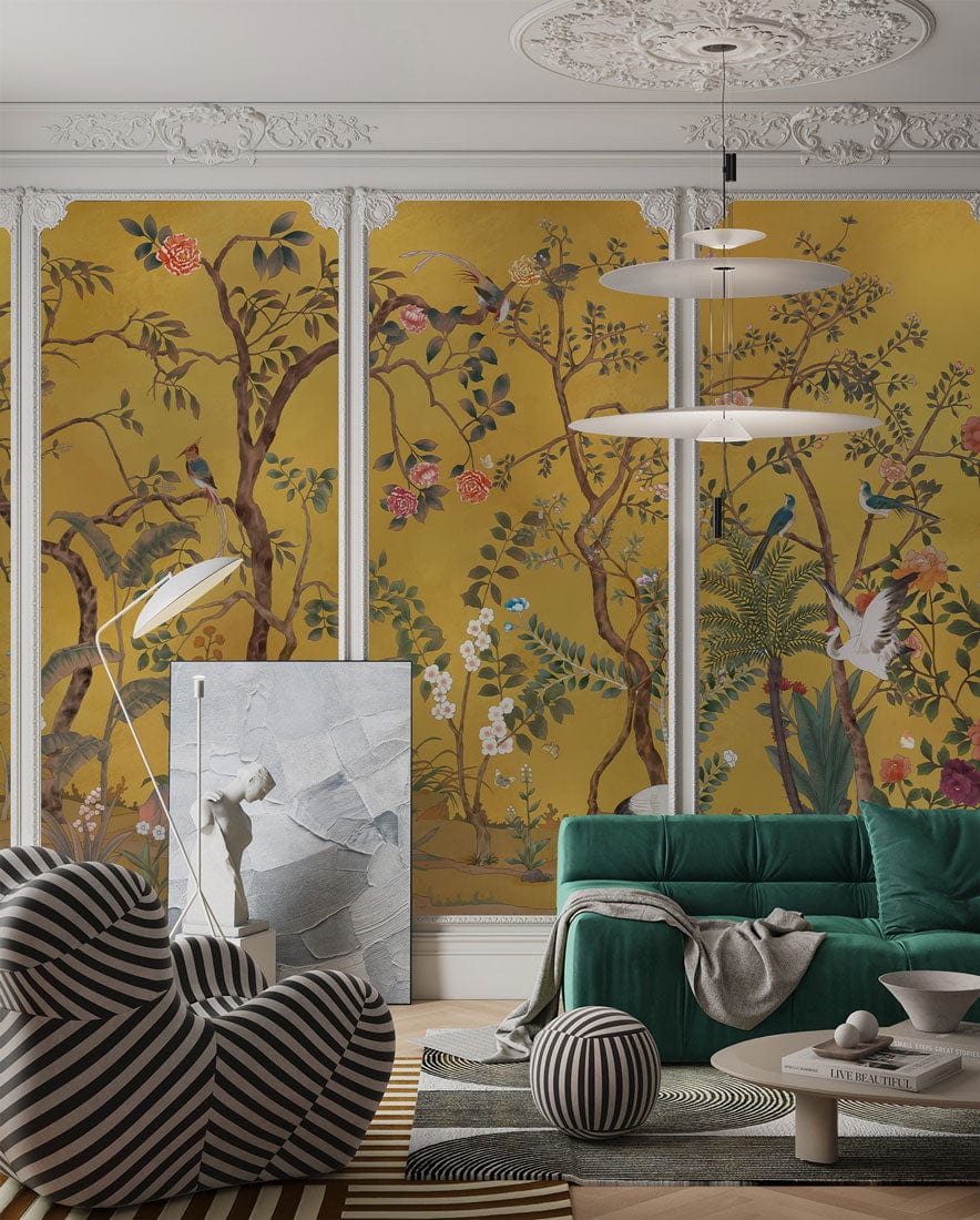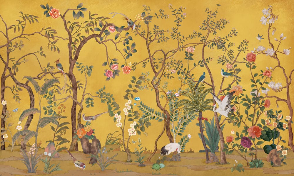 Golden Garden Serenade Mural Wallpaper exudes elegance with its intricate depiction of a lush garden brimming with vivid flora and graceful birds. The mural's detailed artistry and rich, gilded background create an ambience of timeless sophistication, making it an exquisite choice for any space seeking a touch of nature's opulent charm.