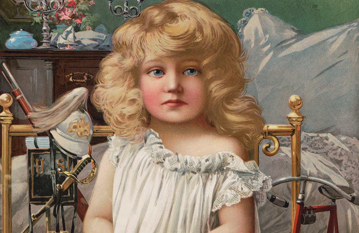 Santa Claus' Mistake Wallpaper Mural captivates with its nostalgic charm, showcasing a serene child amidst a backdrop of vintage toys and majestic mountains. The intricate details and soft textures impart a dreamy atmosphere, seamlessly fitting into spaces that appreciate timeless elegance.