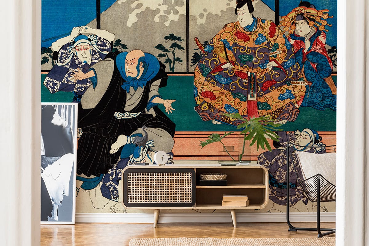 Immerse yourself in the captivating artistry of the Sato Norikiyo Wallpaper Mural, where traditional elegance meets vibrant storytelling. Richly detailed figures, adorned in intricate patterns, are set against a backdrop that evokes serenity and depth. This mural's exquisite design makes it a perfect choice for a refined and cultured setting, adding a narrative layer to any interior space.