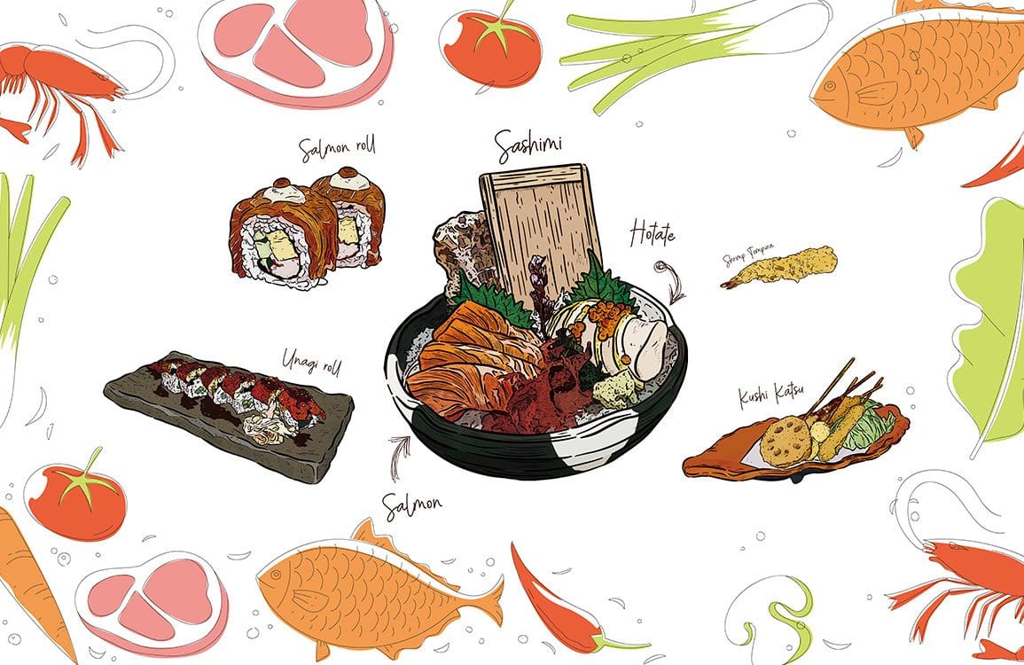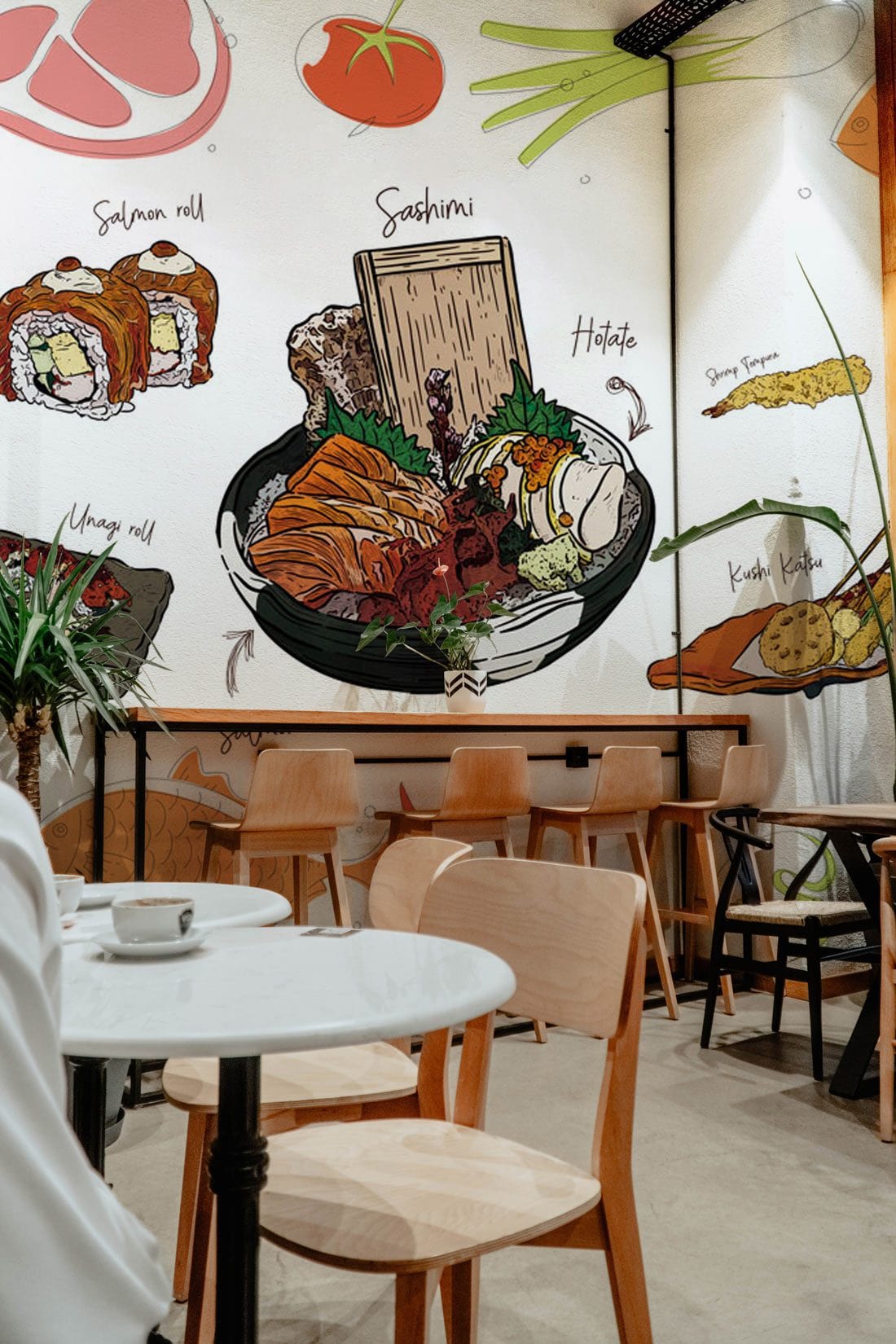 If you love sushi, then you are going to love this wallpaper mural! This wallpaper mural featuring numbers of delicious sushi dishes such as salmon roll, sashimi, and kushi katsu will surely whet your appetite and revamp your space! Great wallpaper for your kitchen and dining for a cool and unique look.