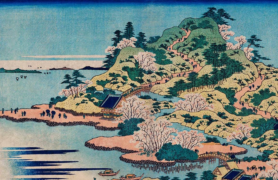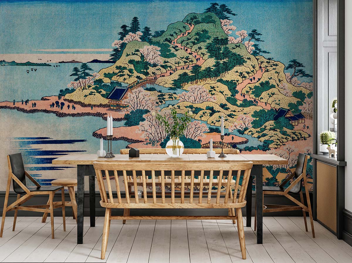Sesshu Ajigawaguchi Tenposan is a classic and time-honored artpiece from Japanese traditional paintings, and it's one of the most popular artwork of Hokusai. What you see on this Sesshu Ajigawaguchi Tenposan Wallpaper Mural is an excellent reproduction of the same artwork. The artist depicts a vintage coastal community with shrines and pilgrims in Japanese Ukyio-e style illustration. With the Japanese aesthetic's appreciation of nature's island beauty, this mural can create a unique feature in your home, especially if you love Japanese landscapes.
