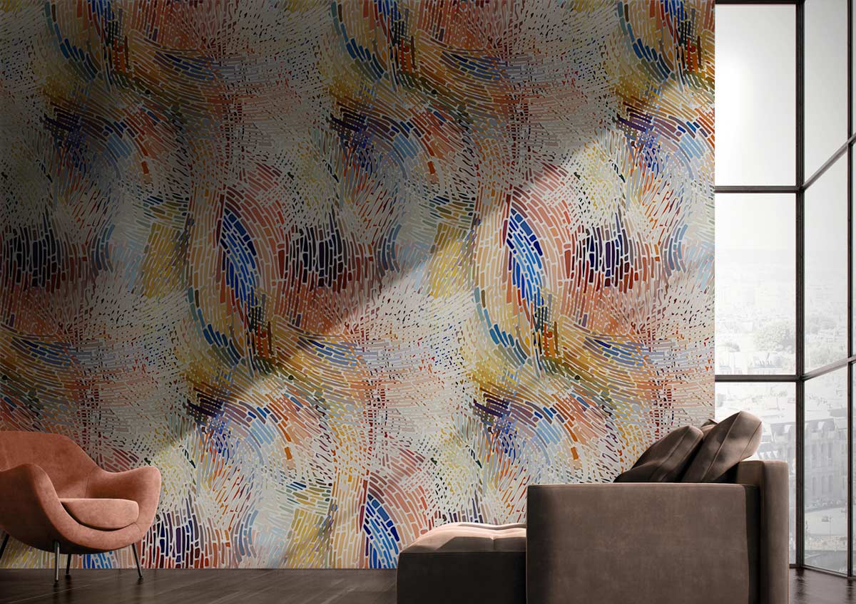 With a colourful shading texture wallpaper vibe your place with colours and energy boosted all over the place with this happy design, the design is one of the modern designs that give you the freedom to locate it at different places at your home. It is so lite and different that will also give your place an effect will make it feel wider and airy. The flow of the curves with the hazy whites makes it like finger prints unique and detailed. This design is a joker for all the house. It can be used at a bedroom with modern style and also at living room with dark blue velvet couches and carpets that will show a different catchy taste in decoration to all your family and friends.