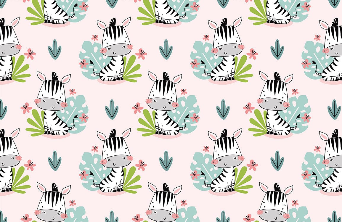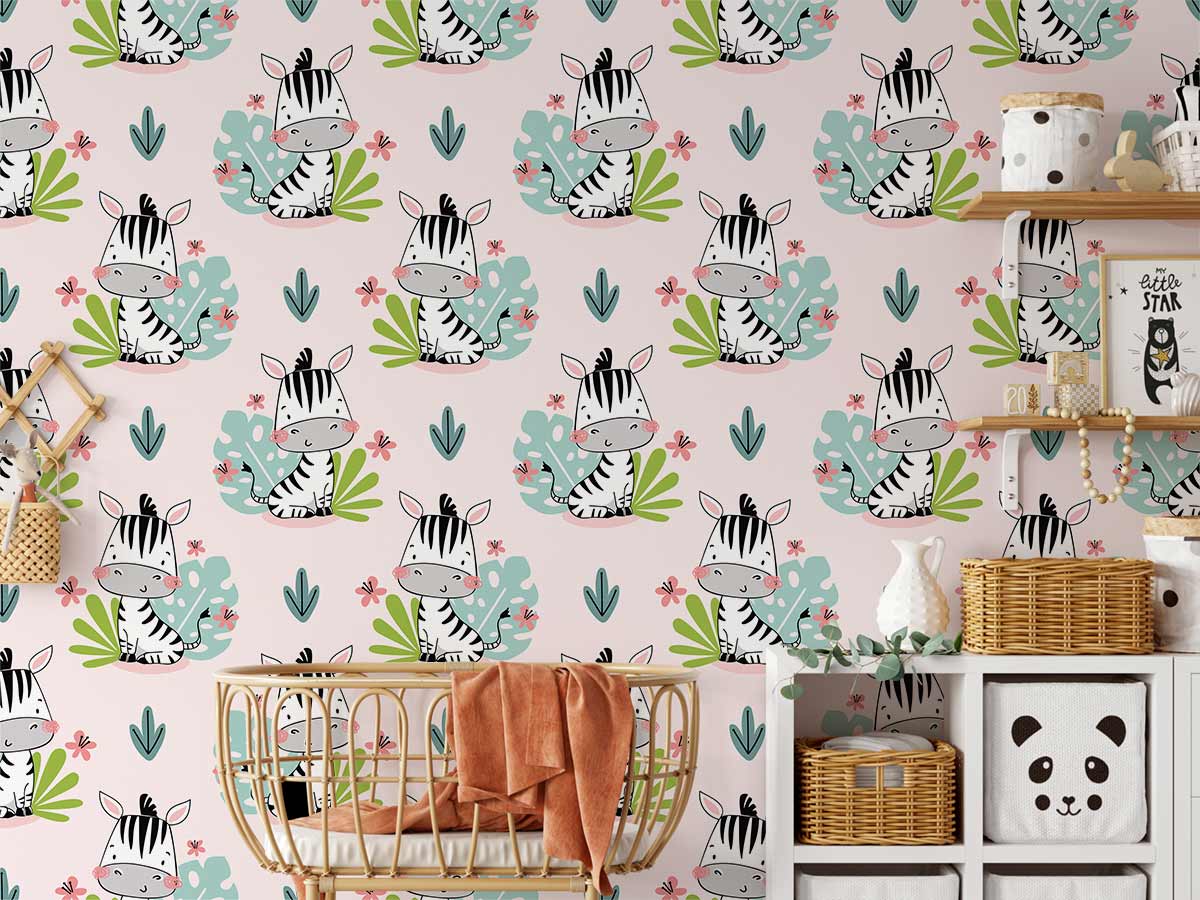 The Zebra in Brushwood Wallpaper Mural showcases an artistic illustration of whimsical zebras nestled amidst delicate greenery. Its playful pattern and soft hues bring a touch of charm, effortlessly merging into a range of interior decors with a sense of sophistication.