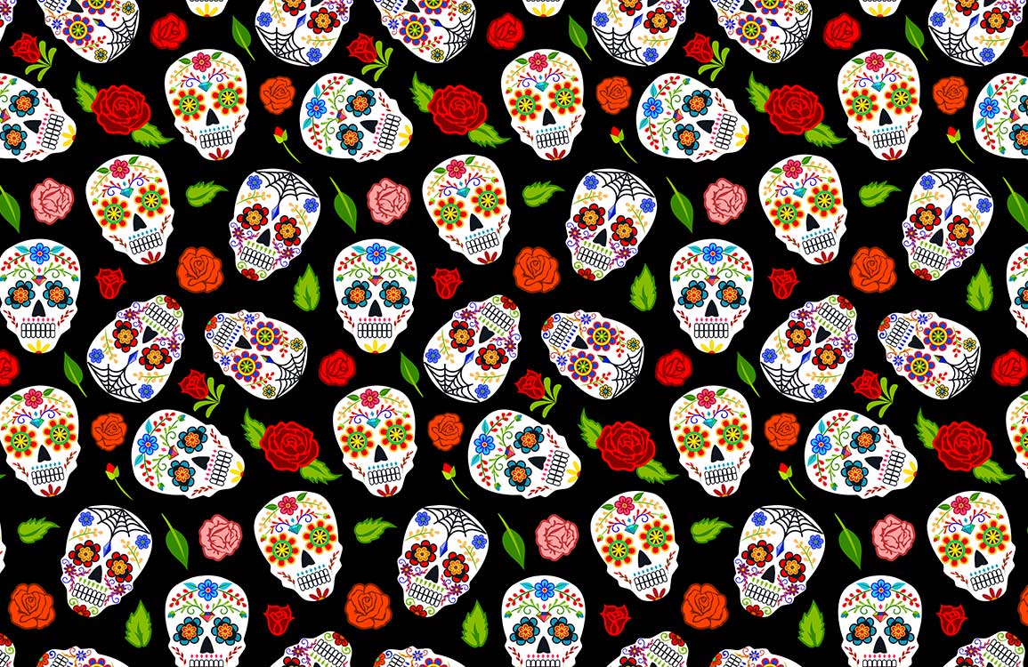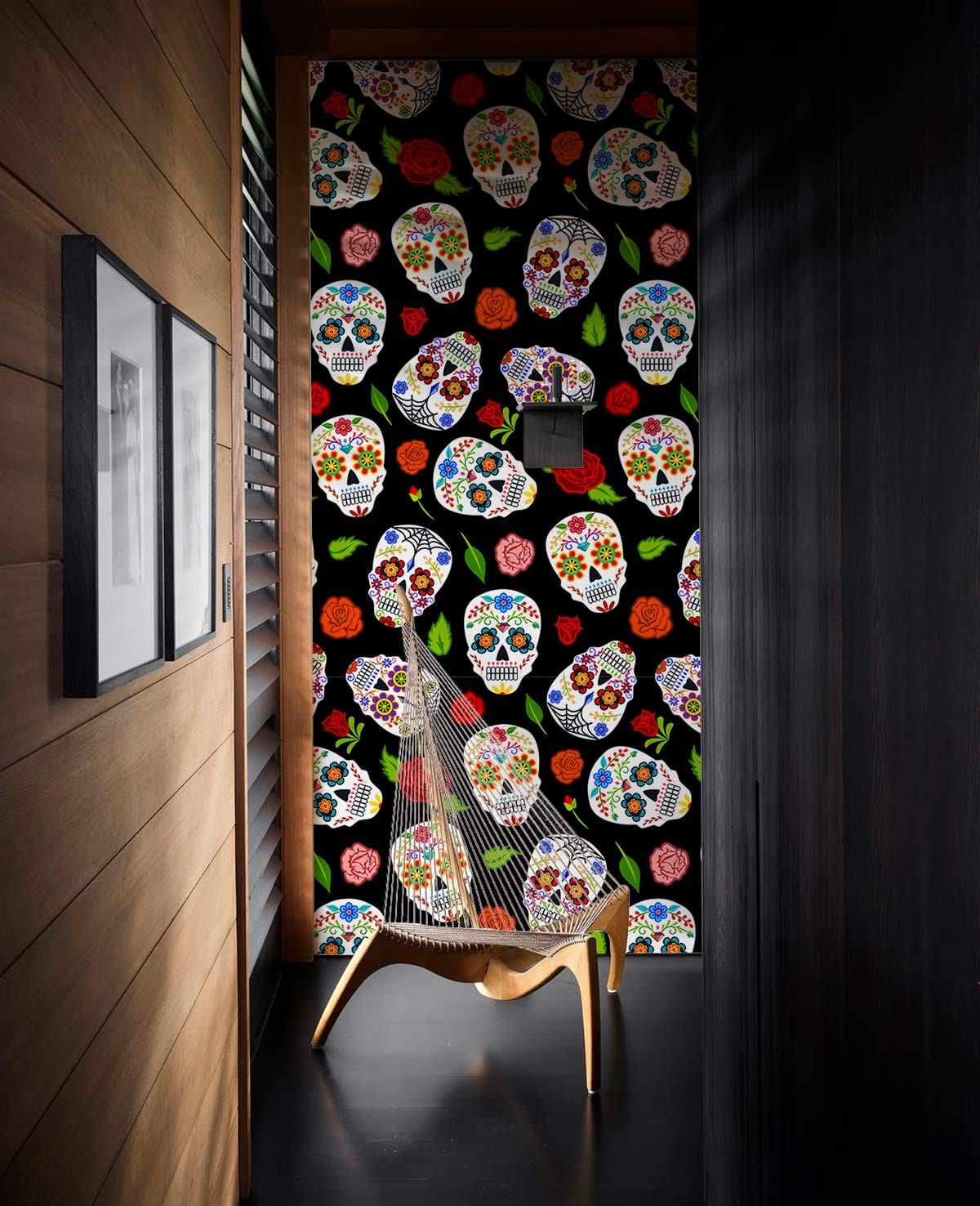The Skeleton & Rose Wallpaper Mural is an artistic expression of contrast and beauty, featuring intricately detailed sugar skulls interwoven with lush roses. Its vivid imagery captivates onlookers with a striking balance between boldness and elegance, making it a captivating choice for spaces that seek a touch of individuality and sophistication.