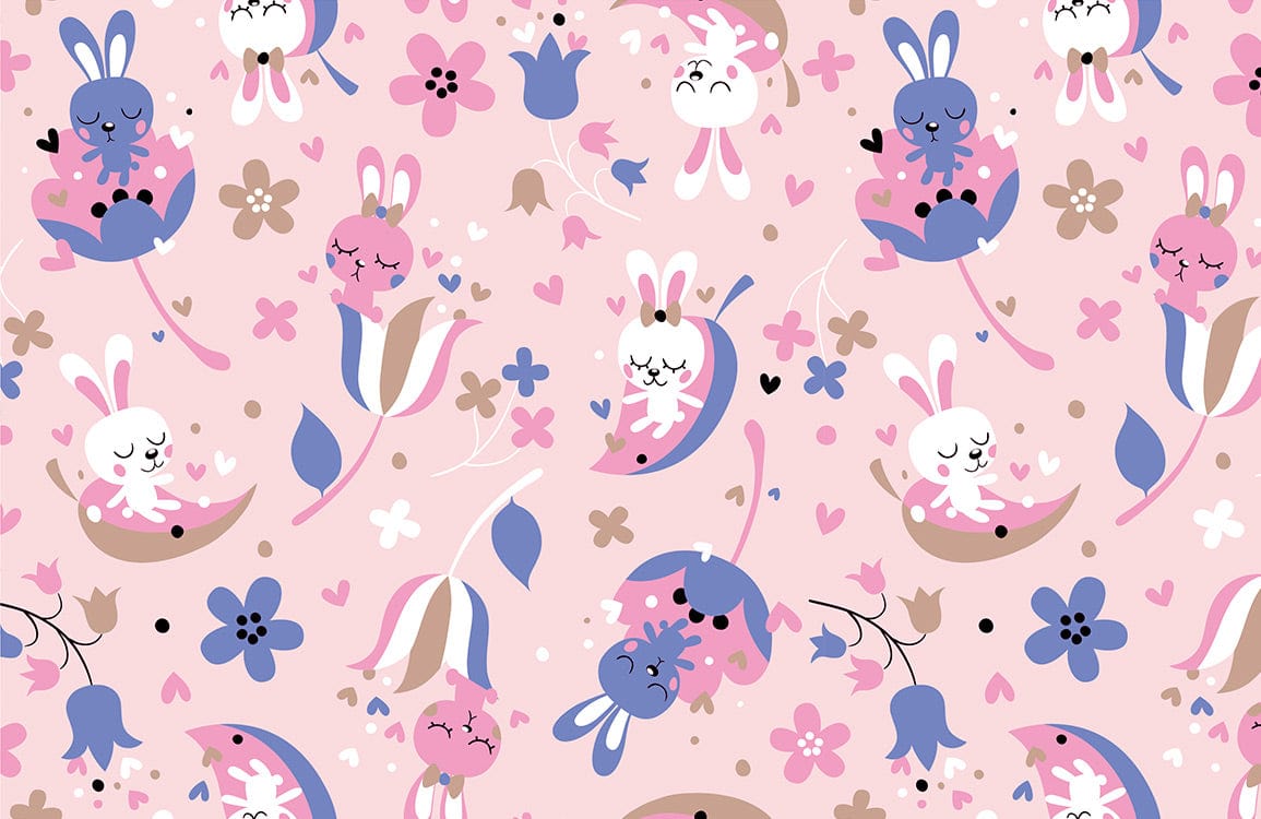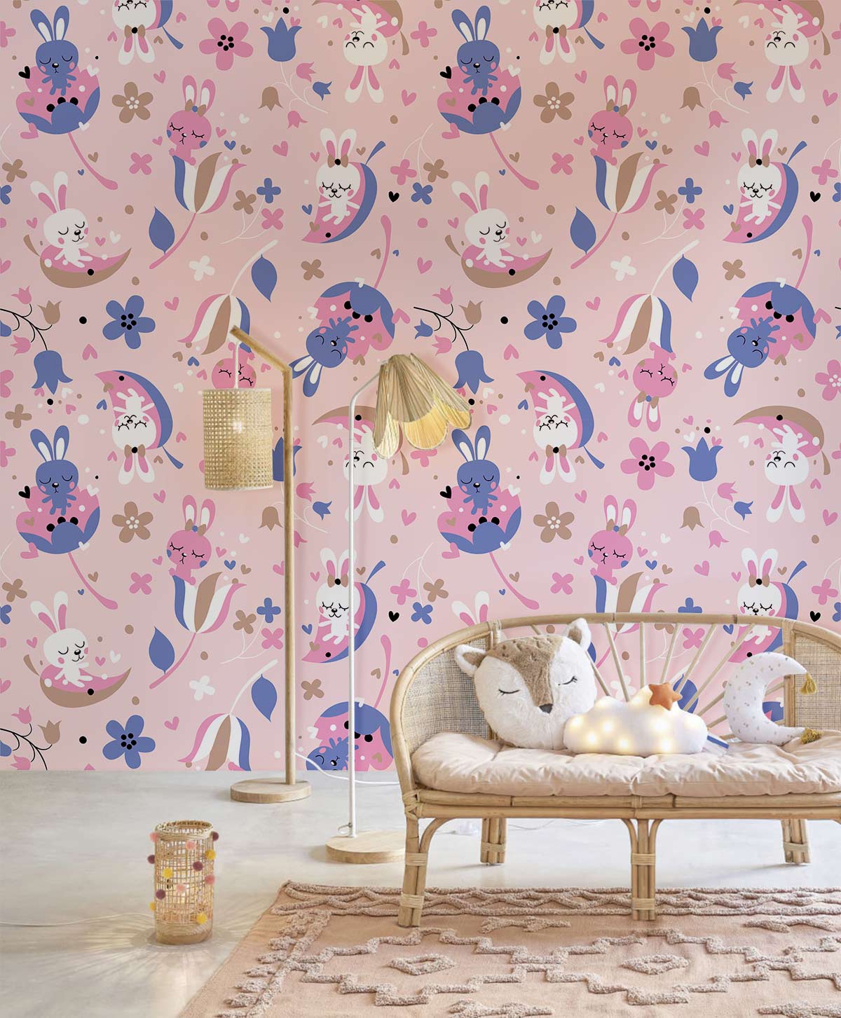 Immerse your space in whimsy with the Sleep Bunny Wallpaper Mural, featuring charming bunnies resting amidst a floral wonderland. This thoughtfully crafted design showcases delicate bunnies nestled among an array of elegant flowers. The playful yet sophisticated aesthetic adds a touch of enchantment, making it equally suitable for a child's room or a chic living area.