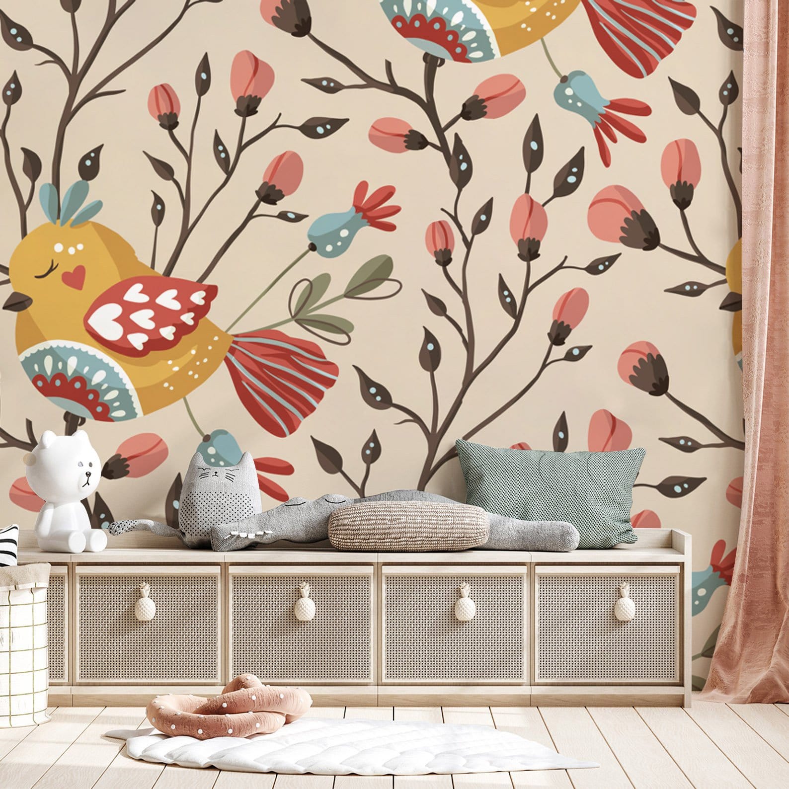 Feel this peaceful moment with this sleeping birds wallpaper mural. This wall mural is designed with cute birds sleeping on the flower branches in pastel colour background, which will surely bring a vintage yet fresh look to your space. Perfect wallpaper that works well with all your bedroom, living room, kitchen and dining hall.