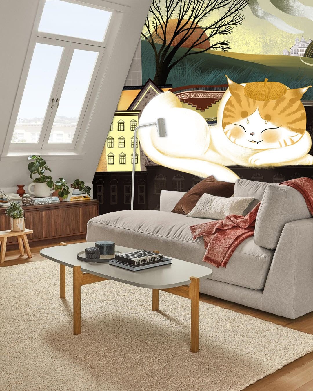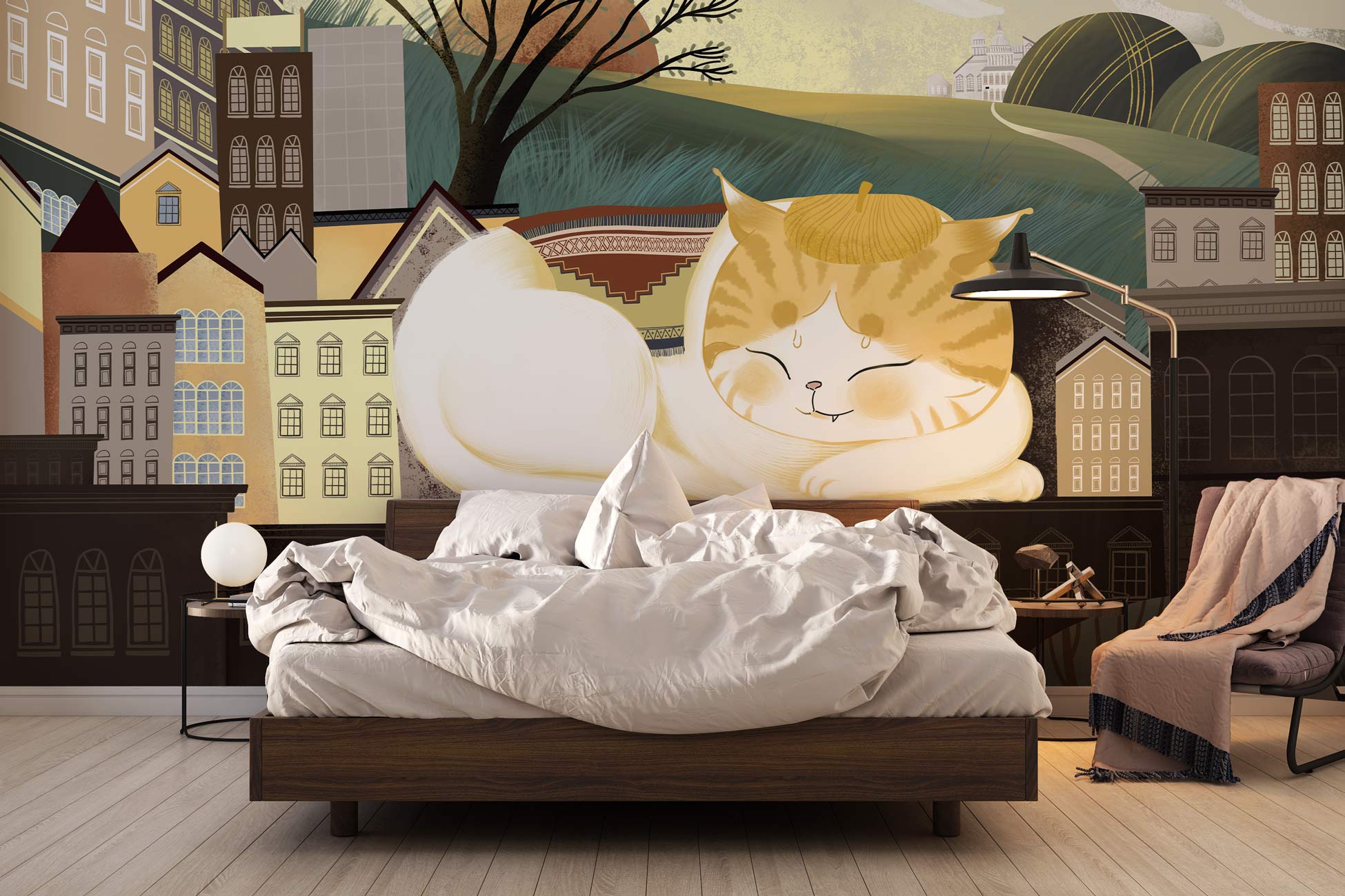 Take a look at this cute cartoon cat taking a nap. Painted with colouful colours that will be perfect for your child隆炉s bedroom or playroom. Place this adorable cat wallpaper on the wall that is next to their bed and enjoy the colourful and lively feeling it brings to you.