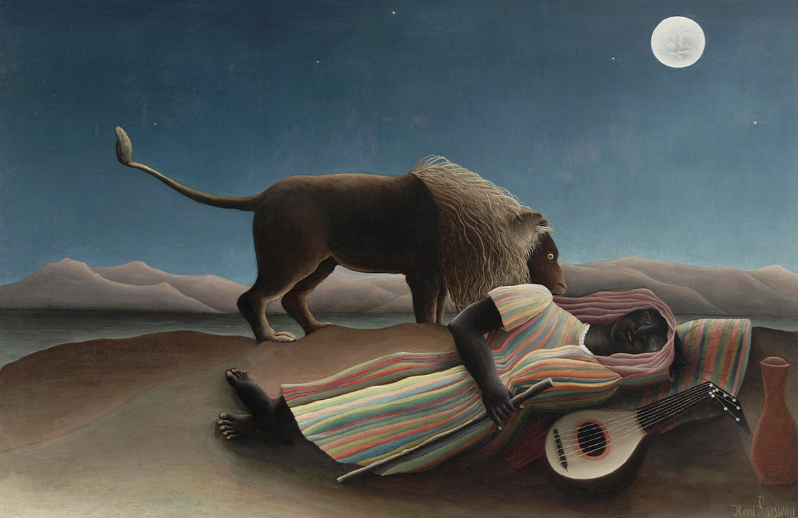The Sleeping Gypsy Wallpaper Mural mesmerises with its dreamlike depiction of a serene nightscape. A harmonious blend of deep blues and earth tones creates a captivating ambience that gently envelops any room. The mural's intricate details, from the delicate moonlight to the textured fabrics, instil a sense of timeless sophistication and artistic flair. Ideal for creating a captivating feature wall, it seamlessly weaves into traditional or contemporary interiors with grace.