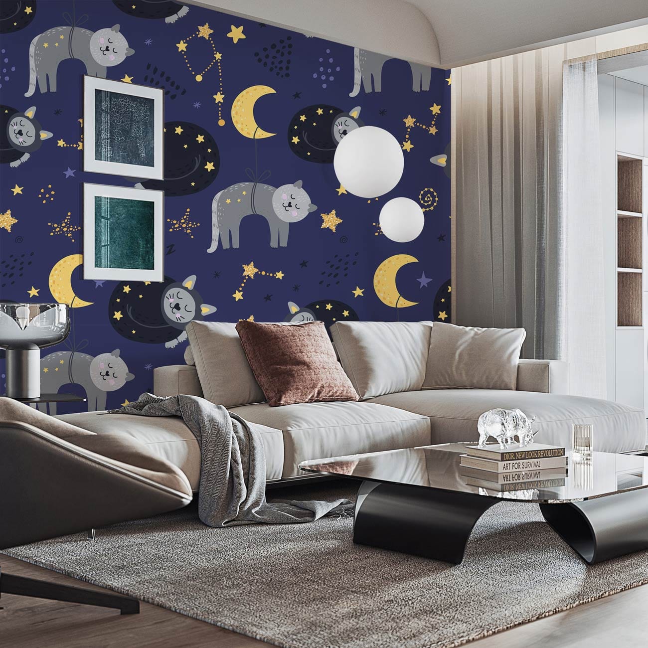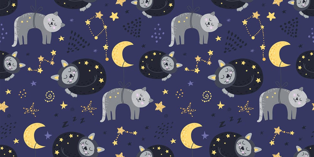 Immerse your space in the whimsical charm of the Sleepy Cat Wallpaper Mural, where serene felines drift amongst starry constellations and mellow crescent moons. The intricate design, paired with a rich navy backdrop, creates an otherworldly atmosphere, evoking a sense of tranquillity and wonder. This mural effortlessly fits into any setting, offering a playful yet sophisticated element to your décor.