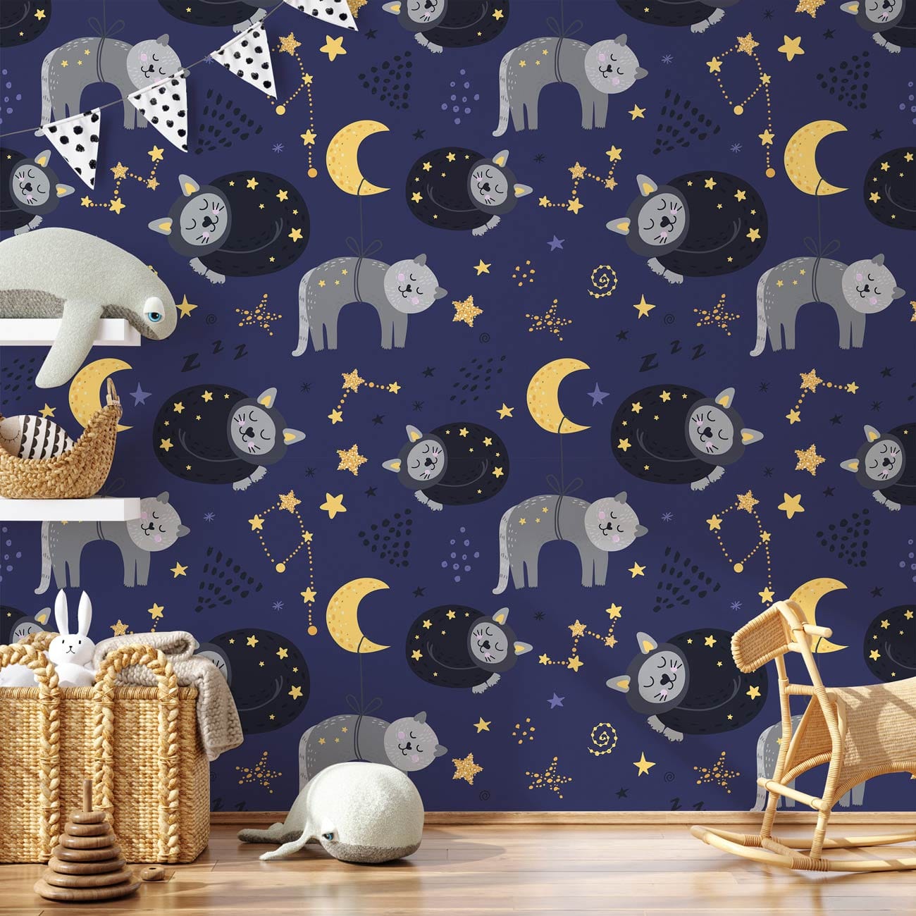 Show off the feline lover in you with our Sleeping Cat Wallpaper Mural! This nursery wallpaper mural is wonderful and enchanting, with a sleeping and dangling cat accompanied by a warm golden moon and stars, perfect to brighten up your little one's room. This mural is a fun and unusual way to add a bit of style to your child's room and bring a timeless spin to your space, with its cat-and-moon design set in a dark blue background.