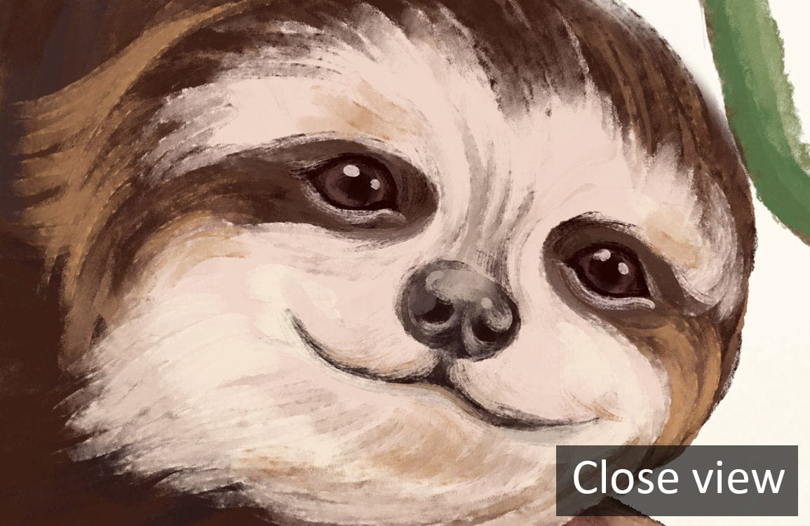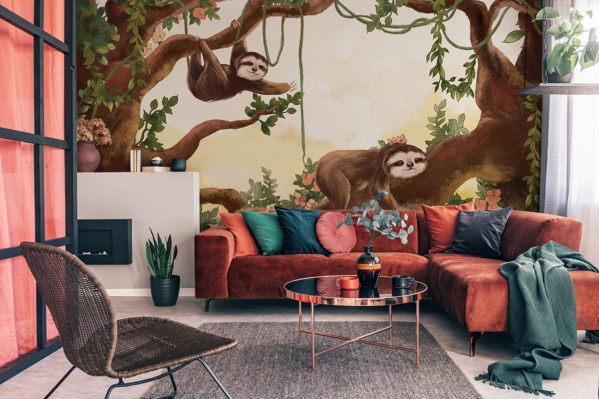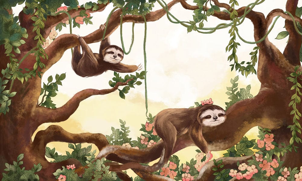 Add a fun and whimsical touch to children's room with our Sloth on Branches Wallpaper Mural. The delightful forest scene will bring joy to any child and even the weariest adult's soul. This oil painting wallpaper mural will quickly create a touch of sophistication and nature because of its calming sloth painting set in a jungle. This sloth wallpaper mural will bring warmth, coziness, and naturalness to your interior decor.