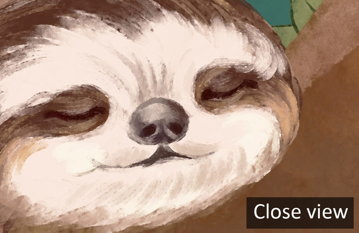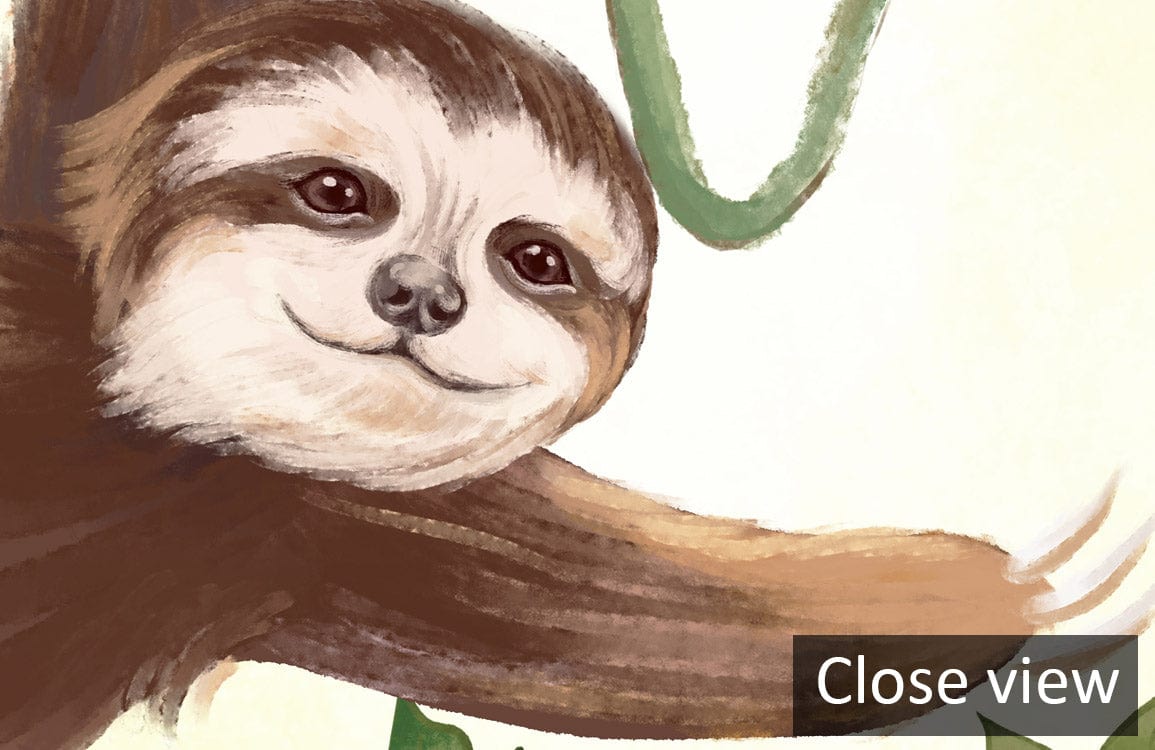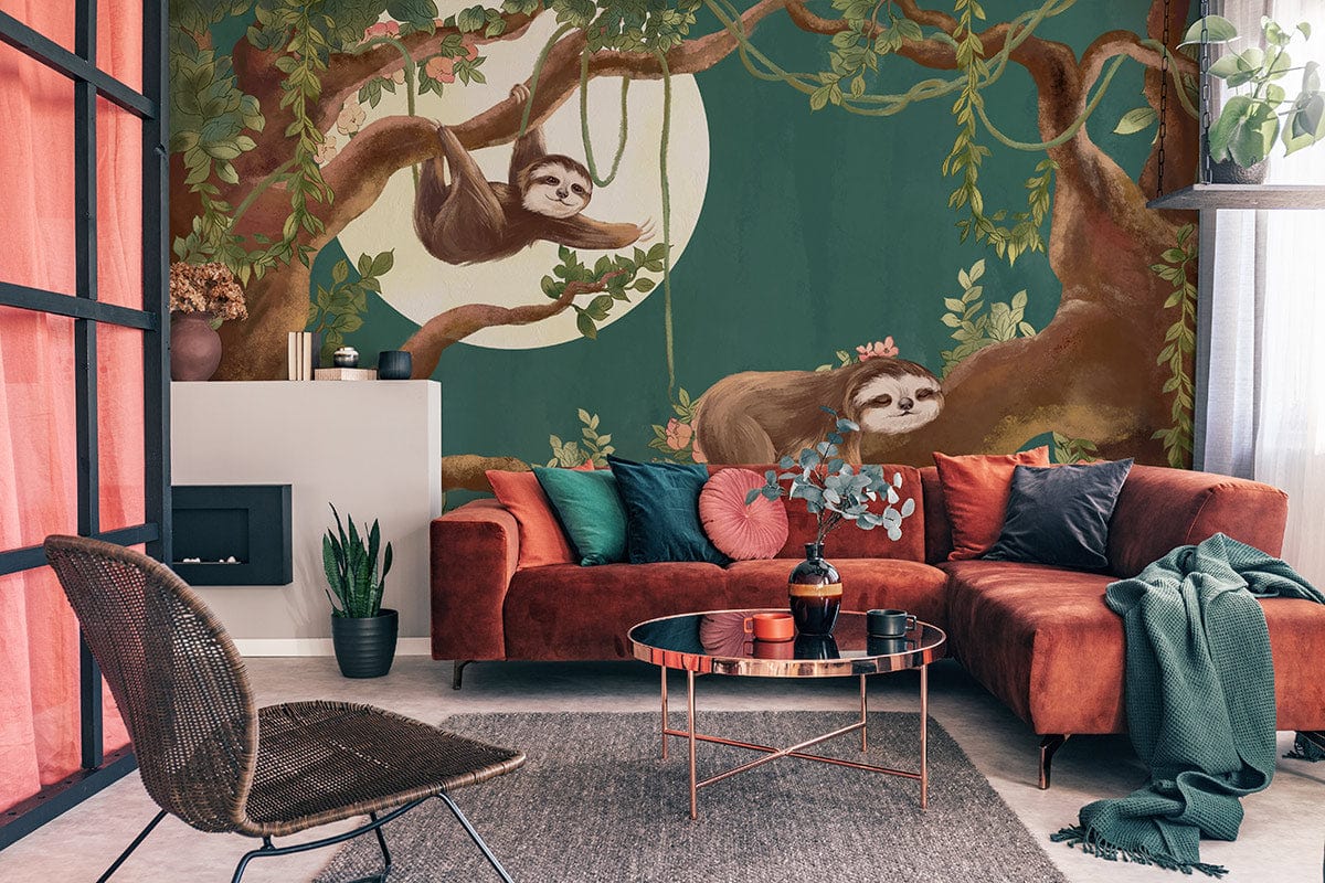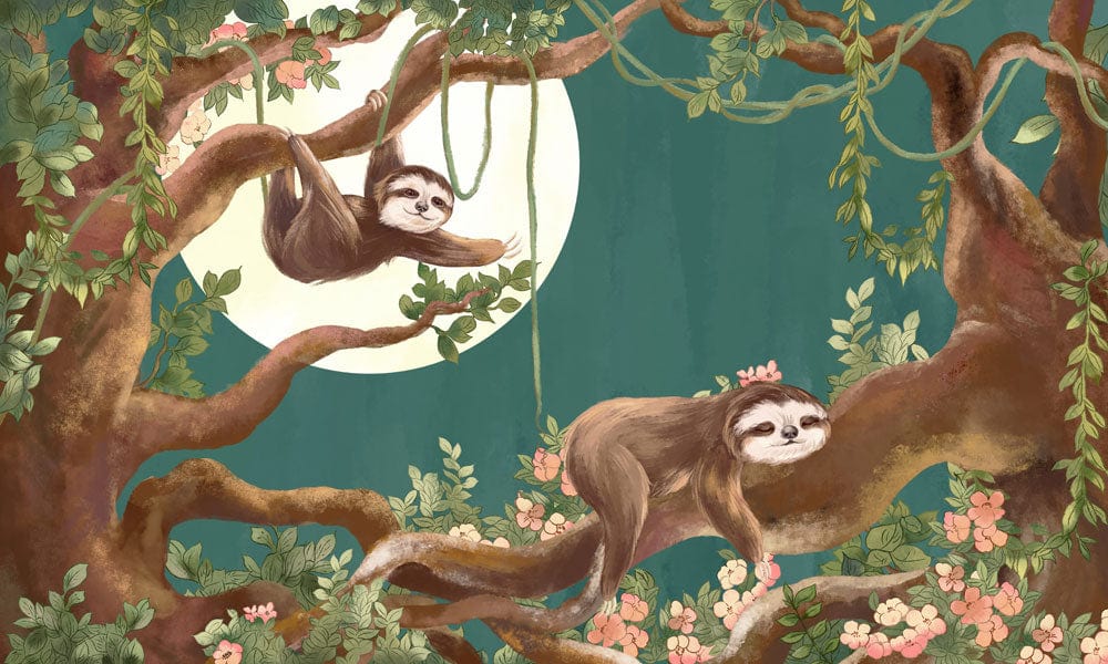 Add a fun and whimsical touch to children's room with our Sloth Gamboling at NIght Wallpaper Mural. The delightful forest scene will bring joy to any child and even the weariest adult's soul. This oil painting wallpaper mural will quickly create a touch of sophistication and nature because of its calming sloth painting set in a jungle. This sloth wallpaper mural will bring warmth, coziness, and naturalness to your interior decor.