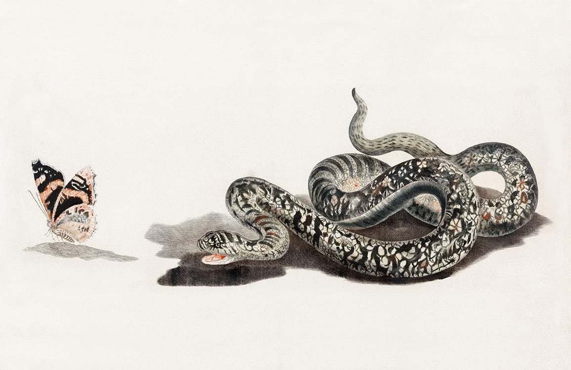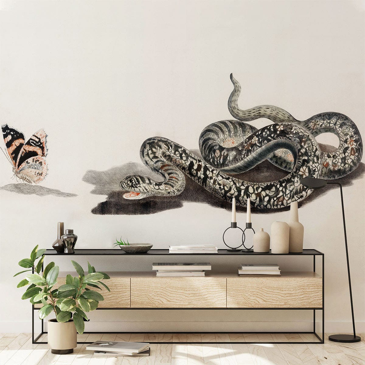 Discover the allure of the Snake & Butterfly Wallpaper Mural, where nature's grace and mystery unite in exquisite detail. The artwork captures a serene interaction between a delicately rendered butterfly and an intricately coiled snake, inviting endless contemplation. The lush textures and subtle contrasts create a striking focal point, perfect for adding a touch of sophistication to any room.