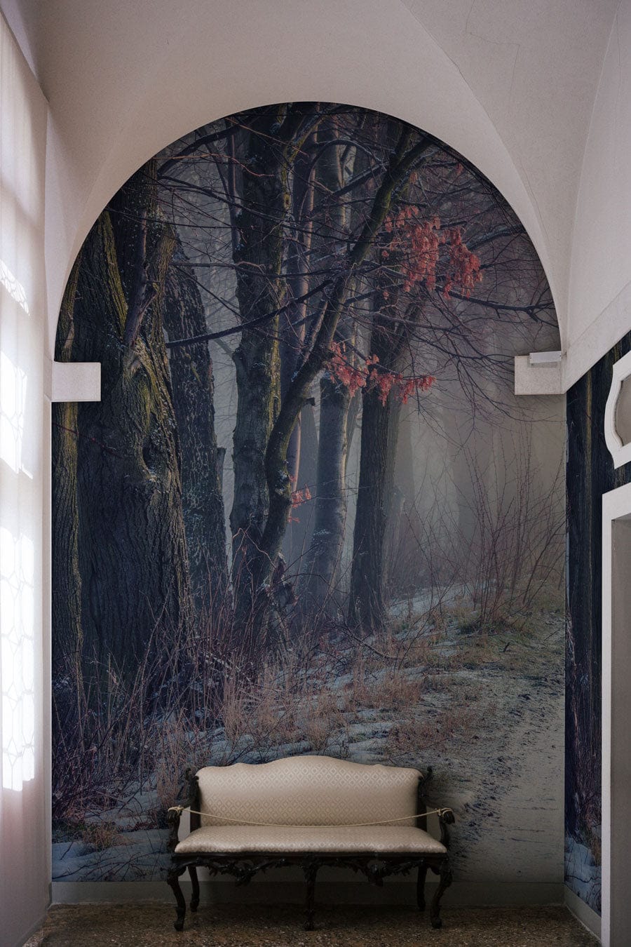 Invite the serene beauty of a winter's embrace into your space with the Snow-covered Trail Wallpaper Mural. This exquisite design captures the tranquil allure of a frosted path, framed by trees delicately dusted with snow. The subtle play of light and shadow brings a sense of depth, creating an inviting escape into nature's quiet elegance. Its sophisticated palette effortlessly complements both contemporary and rustic interiors, offering a timeless aesthetic that elevates any room with its graceful appeal.