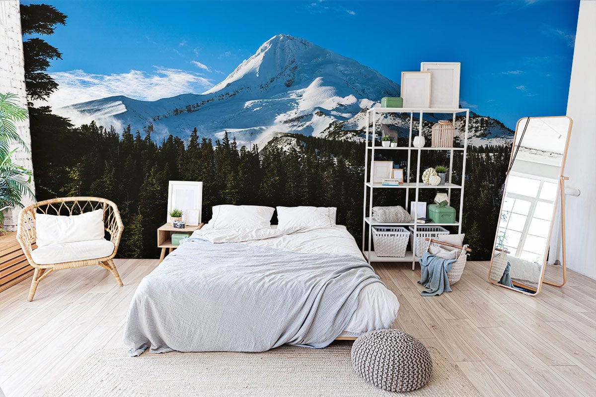 Immerse yourself in the grandeur of the Forest Mountain Wallpaper Mural, where the majesty of a serene, snow-capped peak meets the lush vibrancy of a verdant forest. This exquisite artwork captures the crispness of alpine air and the tranquil embrace of nature, providing a captivating focal point that seamlessly complements both contemporary and traditional interiors.