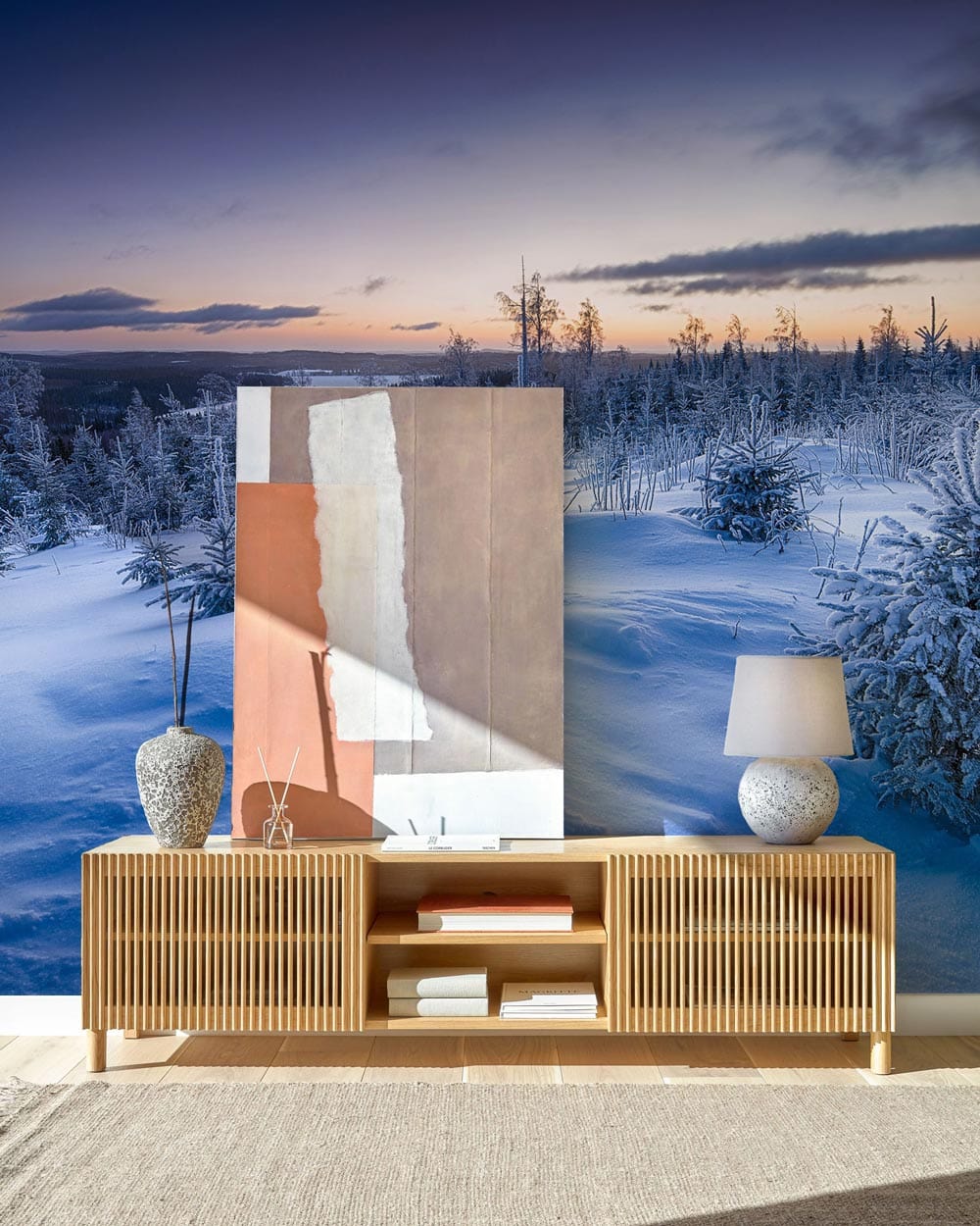 Experience the serene beauty of a snow-kissed landscape with the Snow Scenery at Dawn Wallpaper Mural. This exquisite design captures the tranquil ambiance of early dawn, with soft, powdery snow and delicate frosted trees under a glowing sky. Ideal for a variety of settings, it brings a natural and refined elegance to any room.