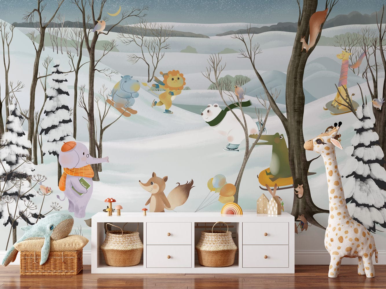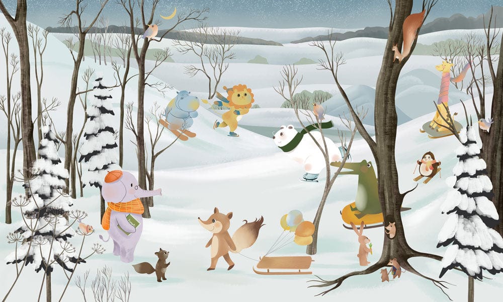 Embrace the whimsical charm of this Snowland Animals Wallpaper Mural, where delicate illustrations capture a serene winter wonderland. Featuring adorable, playful creatures basking in snowy landscapes, this mural brings a touch of enchantment to your interiors. The design's subtle hues and intricate details create a lively yet calming atmosphere, making it a sophisticated choice for various settings.