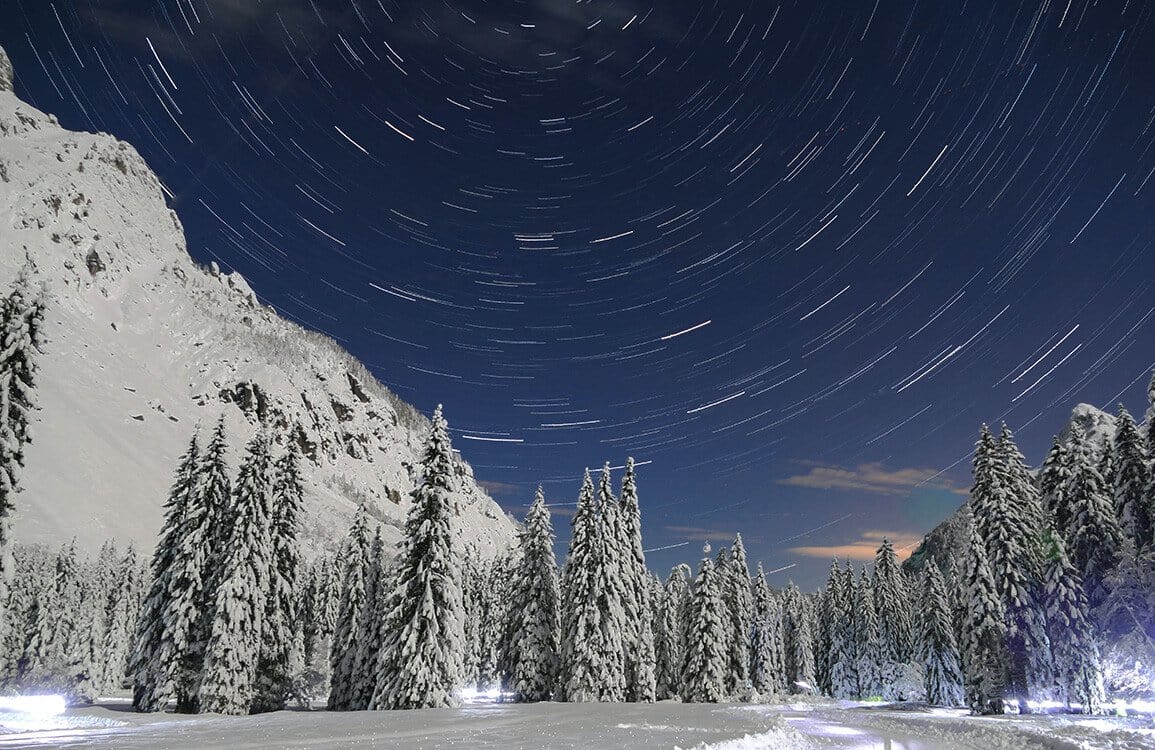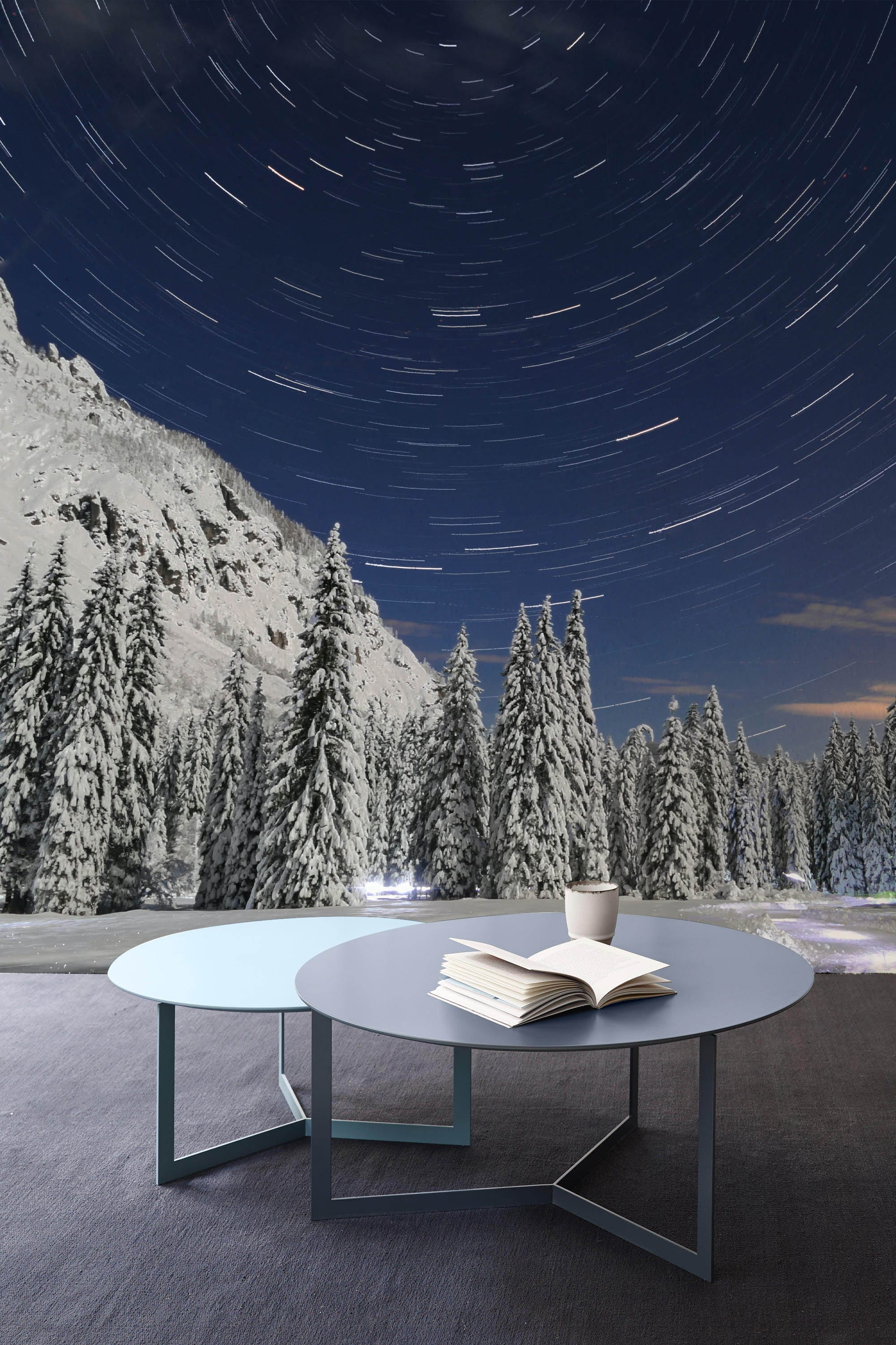 Immerse your space in the serene beauty of the Snowy Land Wallpaper Mural, featuring a captivating scene of towering snow-laden trees under a swirling night sky. The luminous stars trace gentle arcs, creating a sense of motion and tranquillity that graces any room with a touch of natural splendour and artistry.