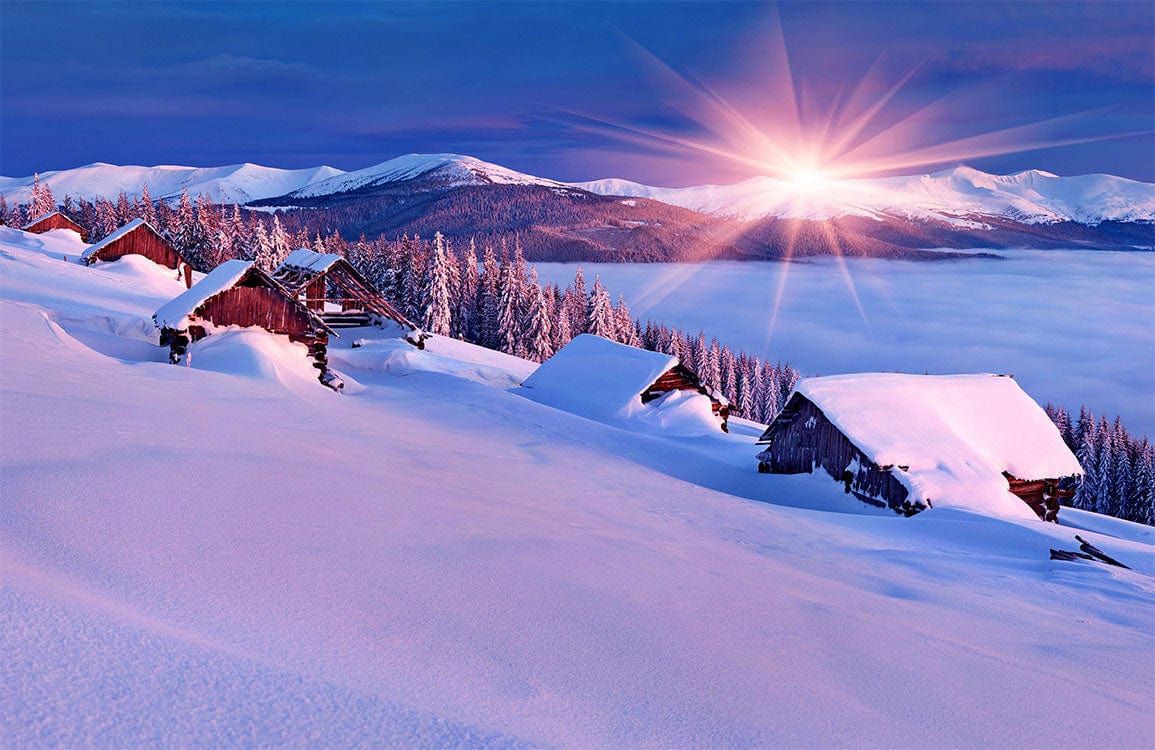 Immerse yourself in the serene elegance of the Snowy Mountain Town Wallpaper Mural, where cosy cabins nestled in a blanket of snow meet the soft glow of a majestic sunrise. This breathtaking scene captures the crisp purity of a winter landscape, infused with hues that bring warmth and tranquillity to any room. Its detailed brushstrokes and subtle textures evoke a sense of timeless beauty, creating a captivating backdrop for both modern and rustic interiors.