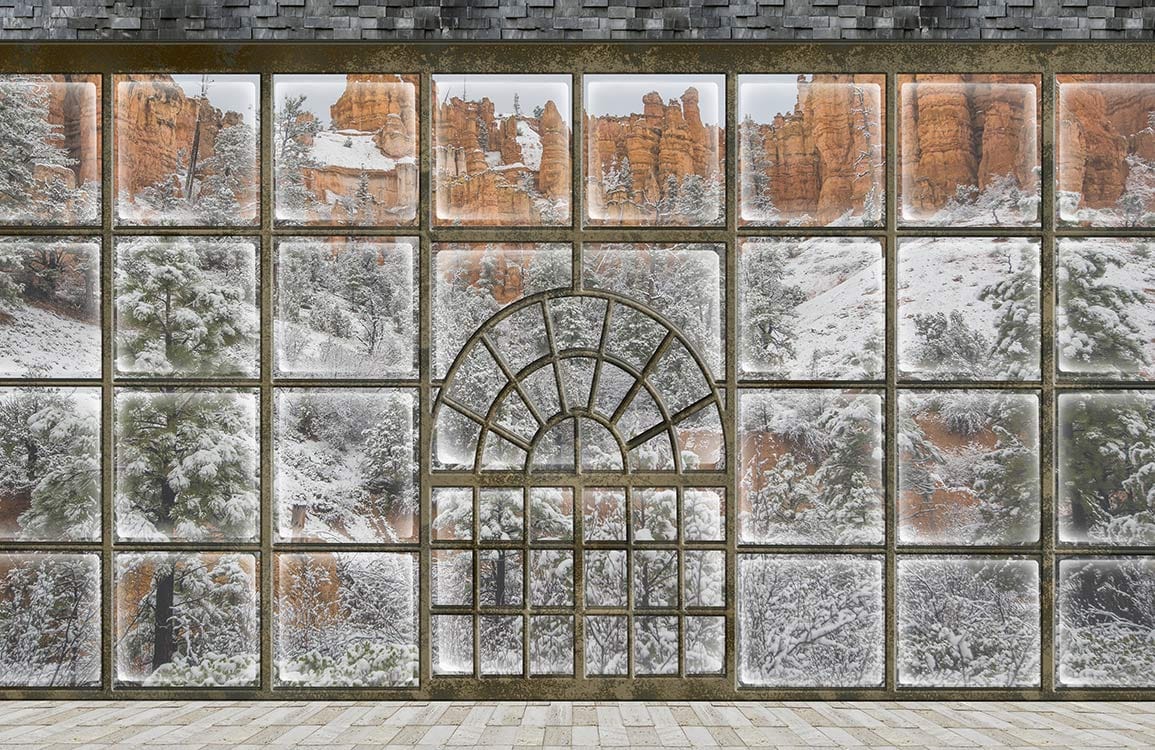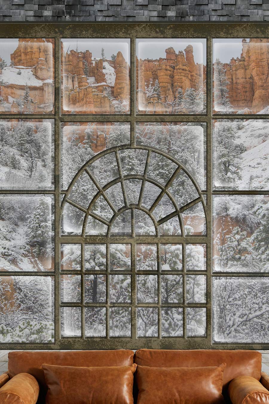 The Snow View Wallpaper Mural captures the serene beauty of a snowy landscape framed by an elegant window design. This mural brings the tranquillity of winter indoors, featuring meticulously crafted details of snow-draped trees and distant red rock formations. Its harmonious blend of natural textures and architectural elements creates a sophisticated atmosphere, ideal for imparting timeless charm to any interior space.