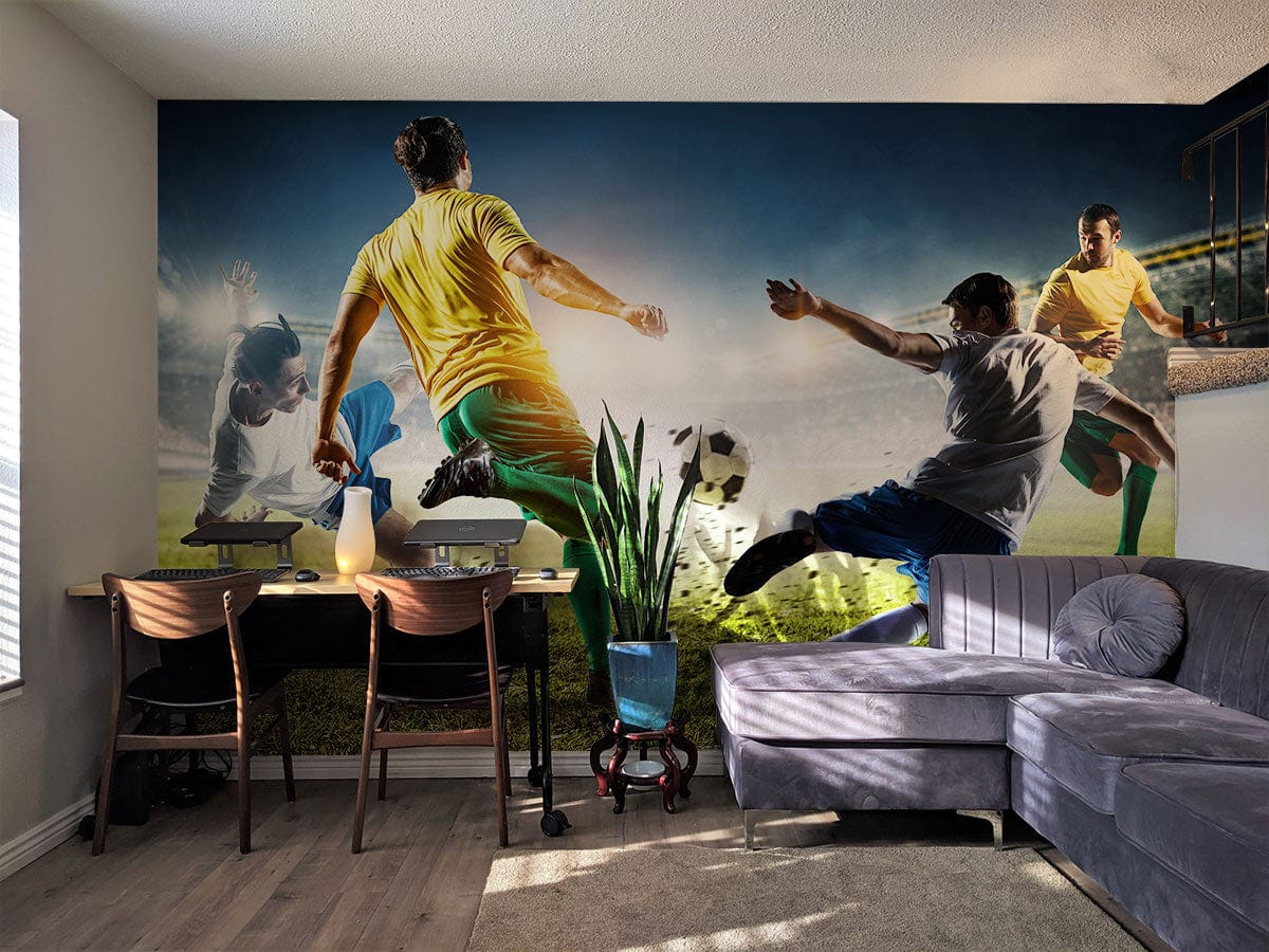Immerse yourself in the exhilarating world of football with the Soccer Scramble Wallpaper Mural. Featuring dynamic figures in motion, this mural captures the essence of the game with a vivid interplay of light and shadow. The intense focus of the players and the vibrant energy of the pitch bring a compelling depth to any space, creating an atmosphere that is both lively and contemplative. Perfect for adding a touch of sporty sophistication to interiors.