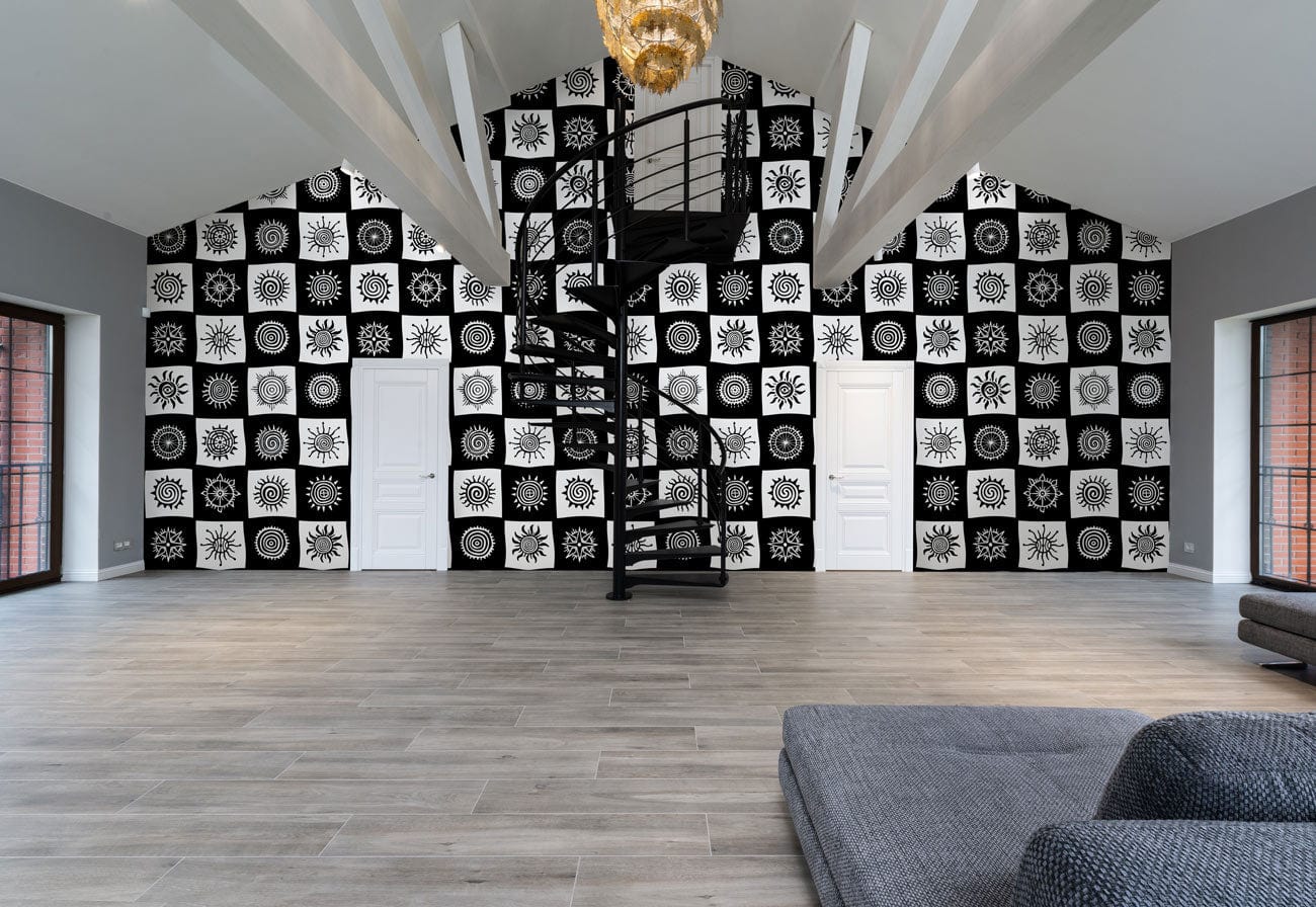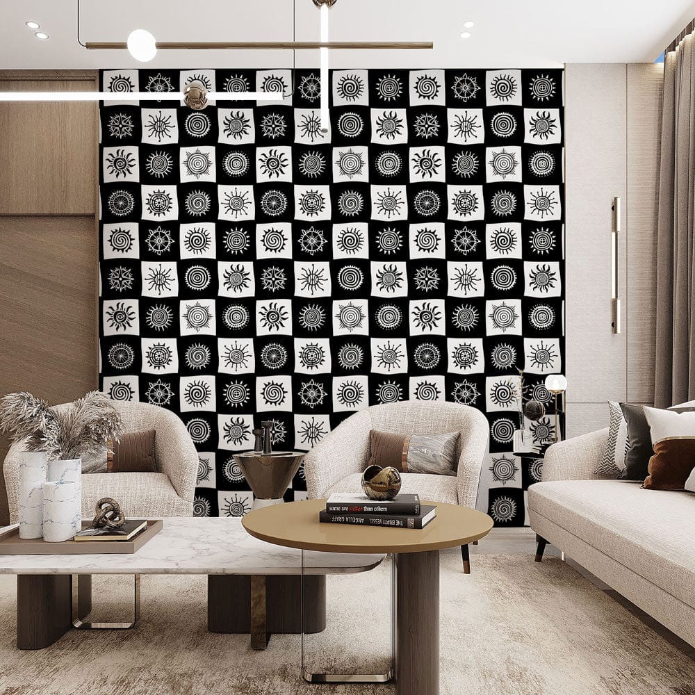 The Solar Symbols Collection Mural Wallpaper features a captivating array of celestial motifs, capturing an intricate dance of sun-inspired designs. The monochromatic palette of black and white offers a striking contrast, creating a timeless ambience that lends itself beautifully to both contemporary and classic interiors. This wallpaper adds a sophisticated touch of elegance with its detailed, artistic patterns and rich textures, providing a unique focal point in any room.