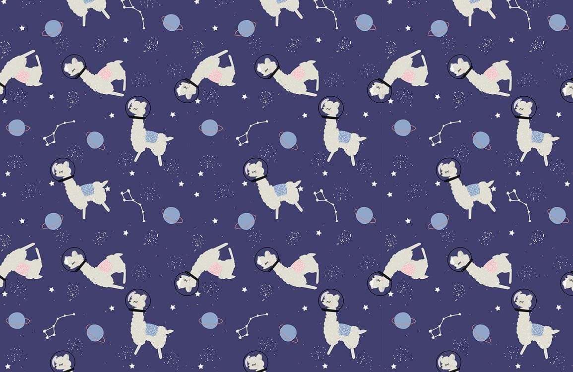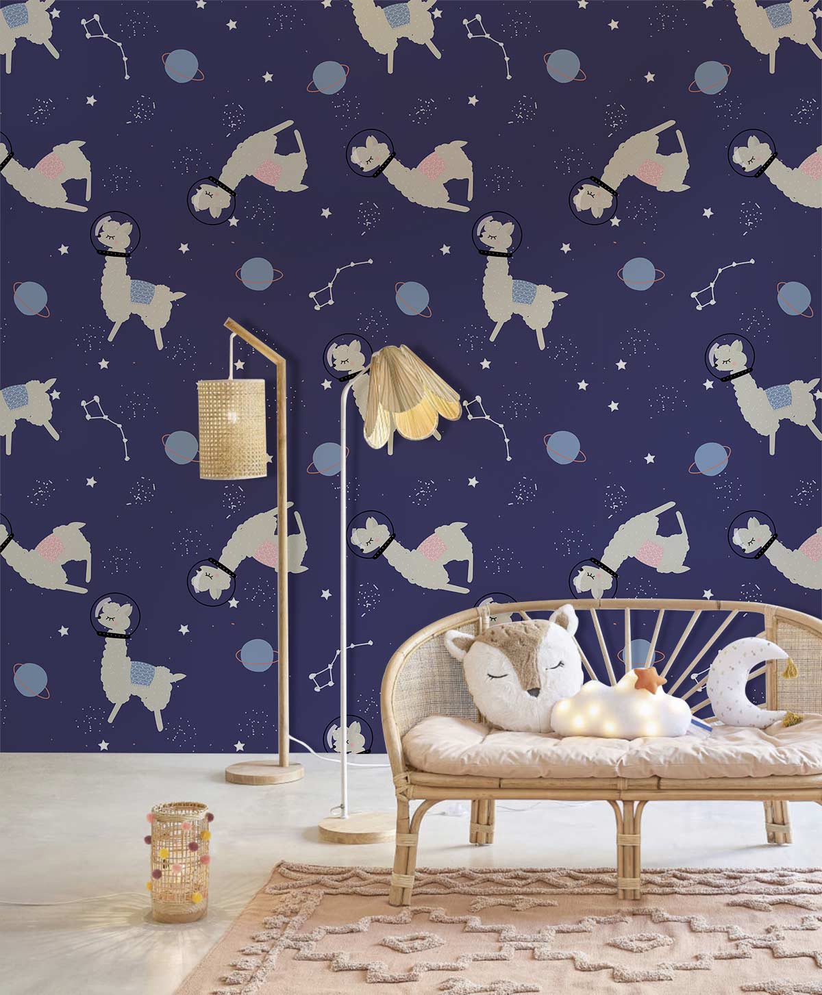 Immerse your space in whimsical elegance with the Space Alpaca Wallpaper Mural. Playful alpacas float amidst celestial motifs set against a serene midnight blue background. Delicate shades of ivory and blush accentuate the alpacas, creating a balance of charm and sophistication. Perfect for adding character and a touch of imagination to various interior settings.