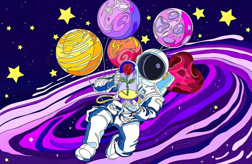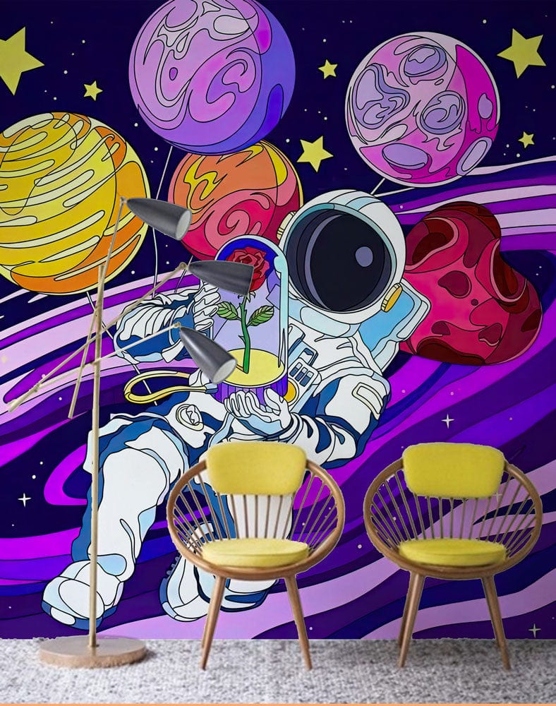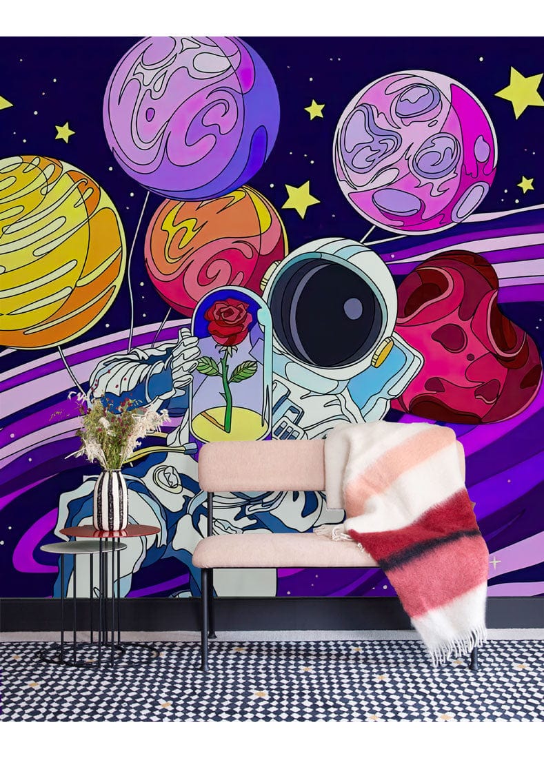 Embrace the celestial allure of the Space Rose Wallpaper Mural, where an enchanting astronaut journey unfolds amidst a cosmic symphony. Vibrant planets and twinkling stars float gracefully around a delicate rose, encapsulating a serene and whimsical universe. This mural exudes artistic finesse with its vivid depiction and smooth textures, perfect for infusing spaces with a sense of wonder and sophistication.