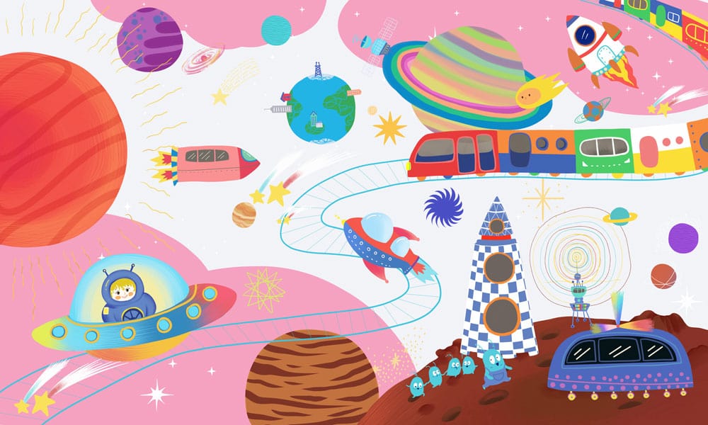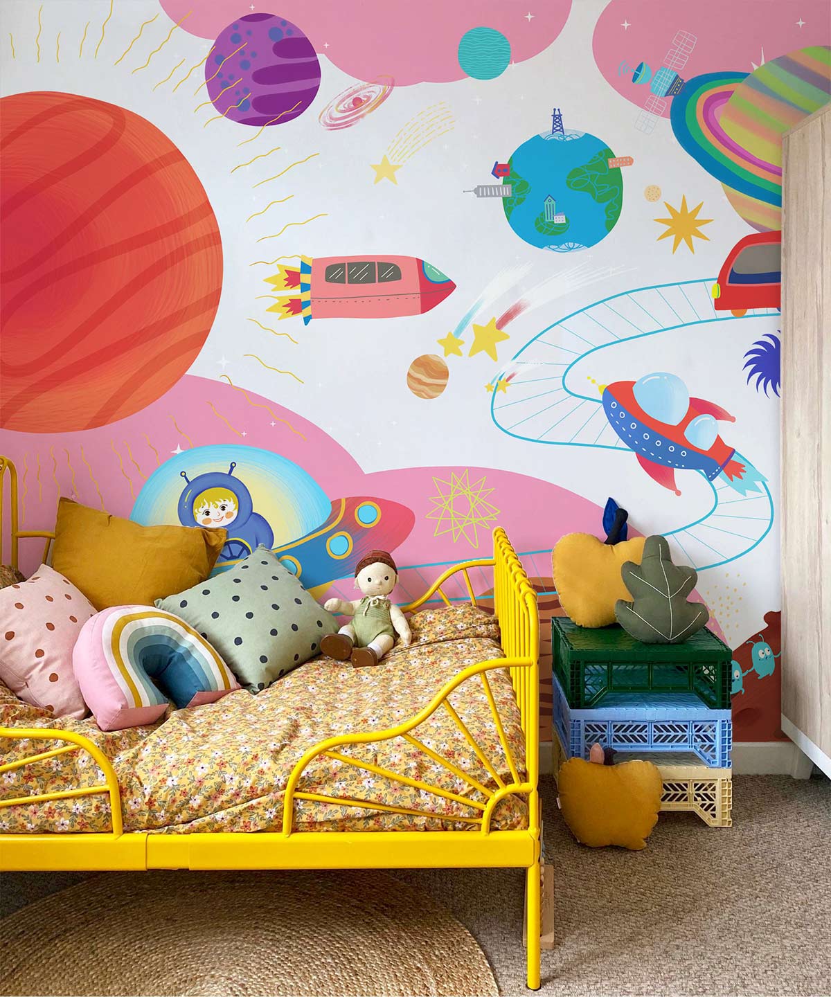 Embark on a whimsical journey with the Space Routine Wallpaper Mural, where vibrant celestial scenes meet playful illustrations. Cheerful planets and quirky spacecraft traverse a cosmic playground, creating a captivating tableau that sparks imagination and joy. This mural seamlessly blends curiosity and artistry, making it an ideal backdrop for any modern setting.